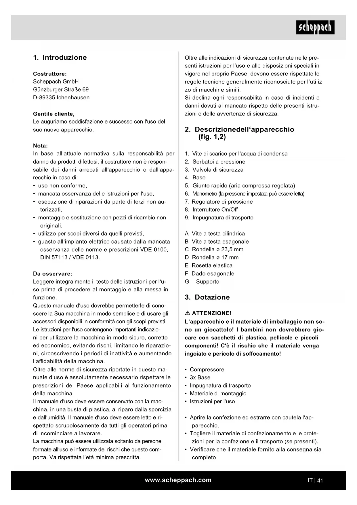 Costruttore: Scheppach GmbH Günzburger Straße 69 D-89335 Ichenhausen Gentile cliente, Le auguriamo soddisfazione e successo con l‘uso del suo nuovo apparecchio. Nota: In base all‘attuale normativa sulla responsabilità per danno da prodotti difettosi, il costruttore non è respon- sabile dei danni arrecati all‘apparecchio o dall‘appa- recchio in caso di: