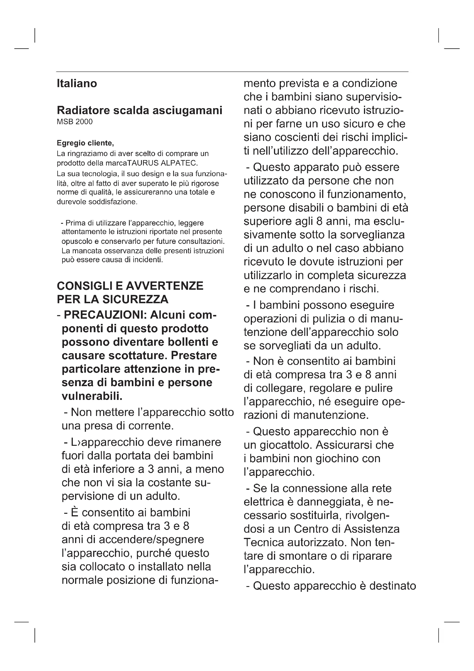 Scarica le istruzioni per il tuo Scaldasalviette elettrico in formato PDF gratuitamente! Trova il tuo manuale Alpatec MSB 2000 - TAURUS e riprendi in mano il tuo dispositivo elettronico. In questa pagina sono pubblicati tutti i documenti necessari per l'utilizzo del tuo dispositivo. Alpatec MSB 2000 del marchio TAURUS.