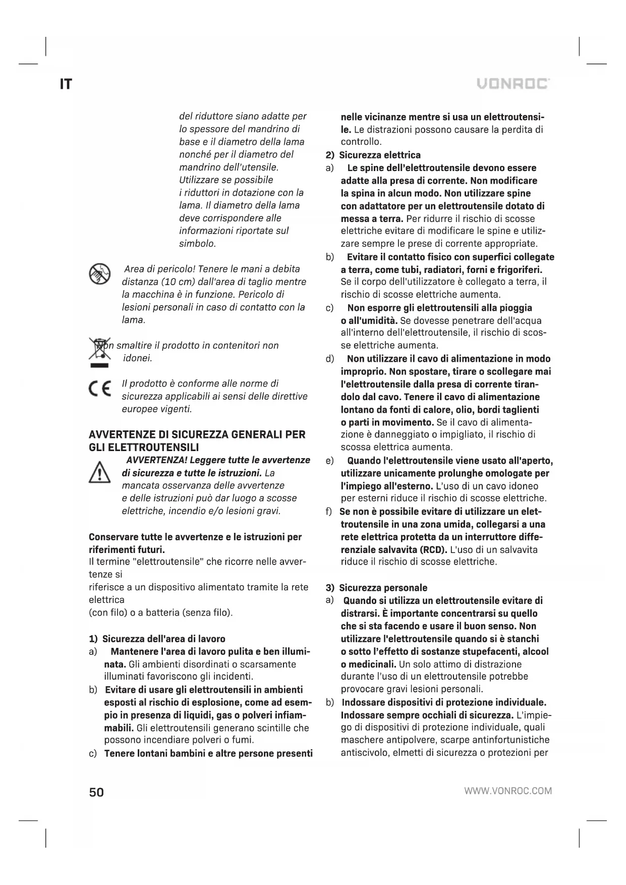 La presente costituisce l'unica garanzia espresa o implicita fornita dall'azienda. Non sono concesse及其他 garanzie, espresse o implicite,或者其他 una detrita in questo manuale, ivi comprese le garanzie implicite di commerciamilità e di idoneità a uno scopo particolare. In nessun caso VONROC sare ritenuta responsabile di alcun danno incidentale o consequencesiale. I rimEDI offerti dai rivenditori si limiteranno alla riparazione o alla sostituzione delle unità o dei componenti non conformi.