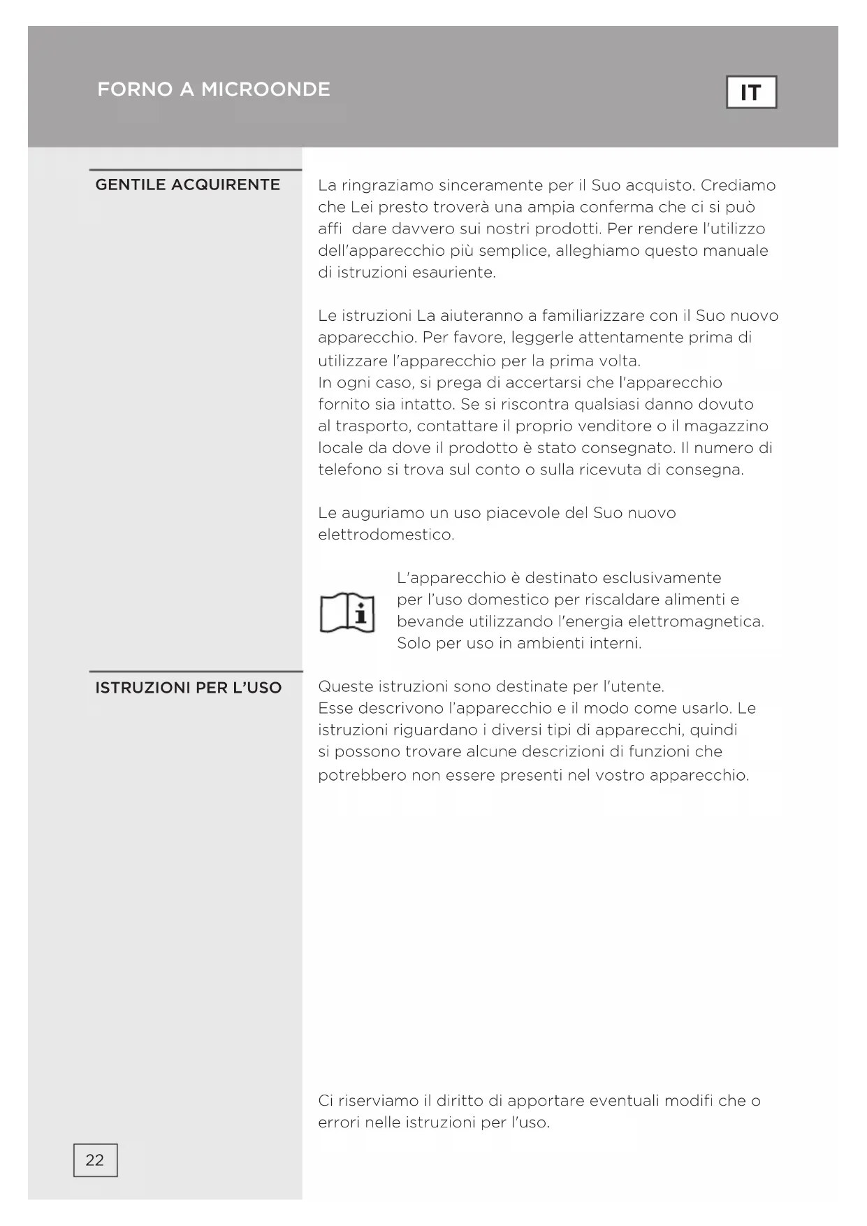 a) Compruebe si se ha establecido el temporizador. b) Compruebe que la puerta está bien cerrada y que se ha enganchado en los pestillos de seguridad. De lo contrario, la energía de microondas no fl uirá dentro del horno. Si nada de lo anterior rectifi ca la situación, contacte con el agente de reparaciones autorizado más cercano. Este aparato de uso doméstico es para calentar alimentos y bebidas utilizando energía electromagnética, sólo para uso interior. Si necesita información o tiene algún problema, en contacto con el Servicio de Atención al Cliente de Hisense en su país (hallará el número de teléfono en el folleto de la garantía mundial). Si no hay Servicio de Atención al Cliente de Hisense en su país, diríjase a su distribuidor local Hisense o póngase en contacto con el Service Department de Hisense Domestic Appliances. ¡SÓLO PARA USO PERSONAL! LE DESEAMOS QUE DISFRUTE MIENTRAS UTILIZA SU APARATO ANTES DE LLAMAR AL CENTRO DE REPARACIONES GARANTÍA Y SERVICIOLa ringraziamo sinceramente per il Suo acquisto. Crediamo che Lei presto troverà una ampia conferma che ci si può a dare davvero sui nostri prodotti. Per rendere l'utilizzo dell'apparecchio più semplice, alleghiamo questo manuale di istruzioni esauriente. Le istruzioni La aiuteranno a familiarizzare con il Suo nuovo apparecchio. Per favore, leggerle attentamente prima di utilizzare l'apparecchio per la prima volta. In ogni caso, si prega di accertarsi che l'apparecchio fornito sia intatto. Se si riscontra qualsiasi danno dovuto al trasporto, contattare il proprio venditore o il magazzino locale da dove il prodotto è stato consegnato. Il numero di telefono si trova sul conto o sulla ricevuta di consegna. Le auguriamo un uso piacevole del Suo nuovo elettrodomestico. L'apparecchio è destinato esclusivamente per l’uso domestico per riscaldare alimenti e bevande utilizzando l'energia elettromagnetica. Solo per uso in ambienti interni. Queste istruzioni sono destinate per l'utente. Esse descrivono l’apparecchio e il modo come usarlo. Le istruzioni riguardano i diversi tipi di apparecchi, quindi si possono trovare alcune descrizioni di funzioni che potrebbero non essere presenti nel vostro apparecchio. GENTILE ACQUIRENTE