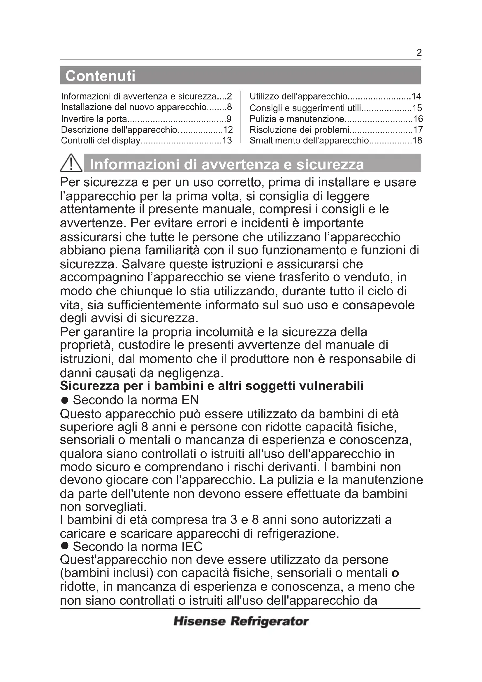 Secondo la norma EN Questo apparecchio può essere utilizzato da bambini di età superiore agli 8 anni e persone con ridotte capacità fisiche, sensoriali o mentali o mancanza di esperienza e conoscenza, qualora siano controllati o istruiti all'uso dell'apparecchio in modo sicuro e comprendano i rischi derivanti. I bambini non devono giocare con l'apparecchio. La pulizia e la manutenzione da parte dell'utente non devono essere effettuate da bambini non sorvegliati. I bambini di età compresa tra 3 e 8 anni sono autorizzati a caricare e scaricare apparecchi di refrigerazione. Secondo la norma IEC Quest'apparecchio non deve essere utilizzato da persone (bambini inclusi) con capacità fisiche, sensoriali o mentali o ridotte, in mancanza di esperienza e conoscenza, a meno che non siano controllati o istruiti all'uso dell'apparecchio da