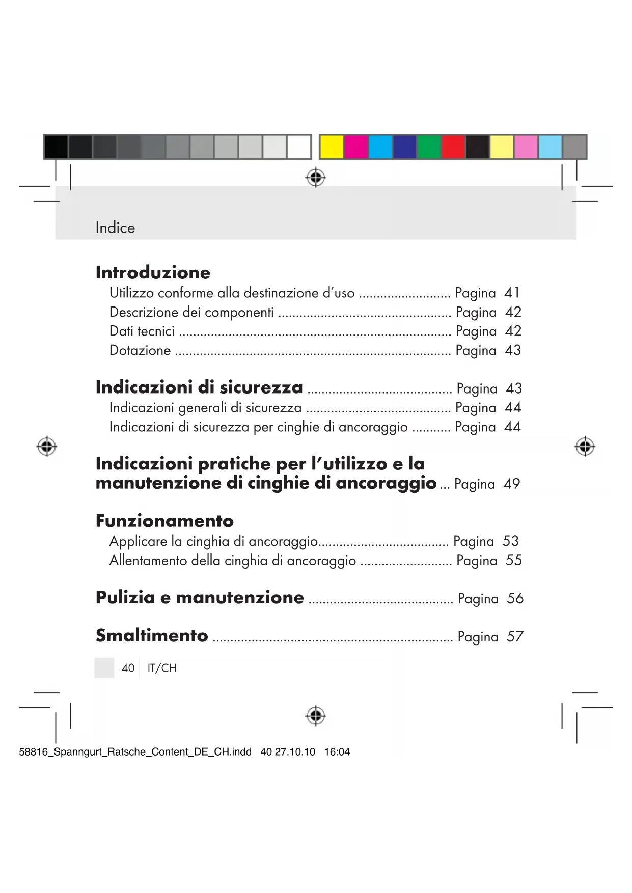 Forza ammessa (LC): 250 daN Materiale: Poliestere (PES) 58816_Spanngurt_Ratsche_Content_DE_CH.indd 42 27.10.10 16:0443 IT/CH Introduzione / Indicazioni di sicurezza