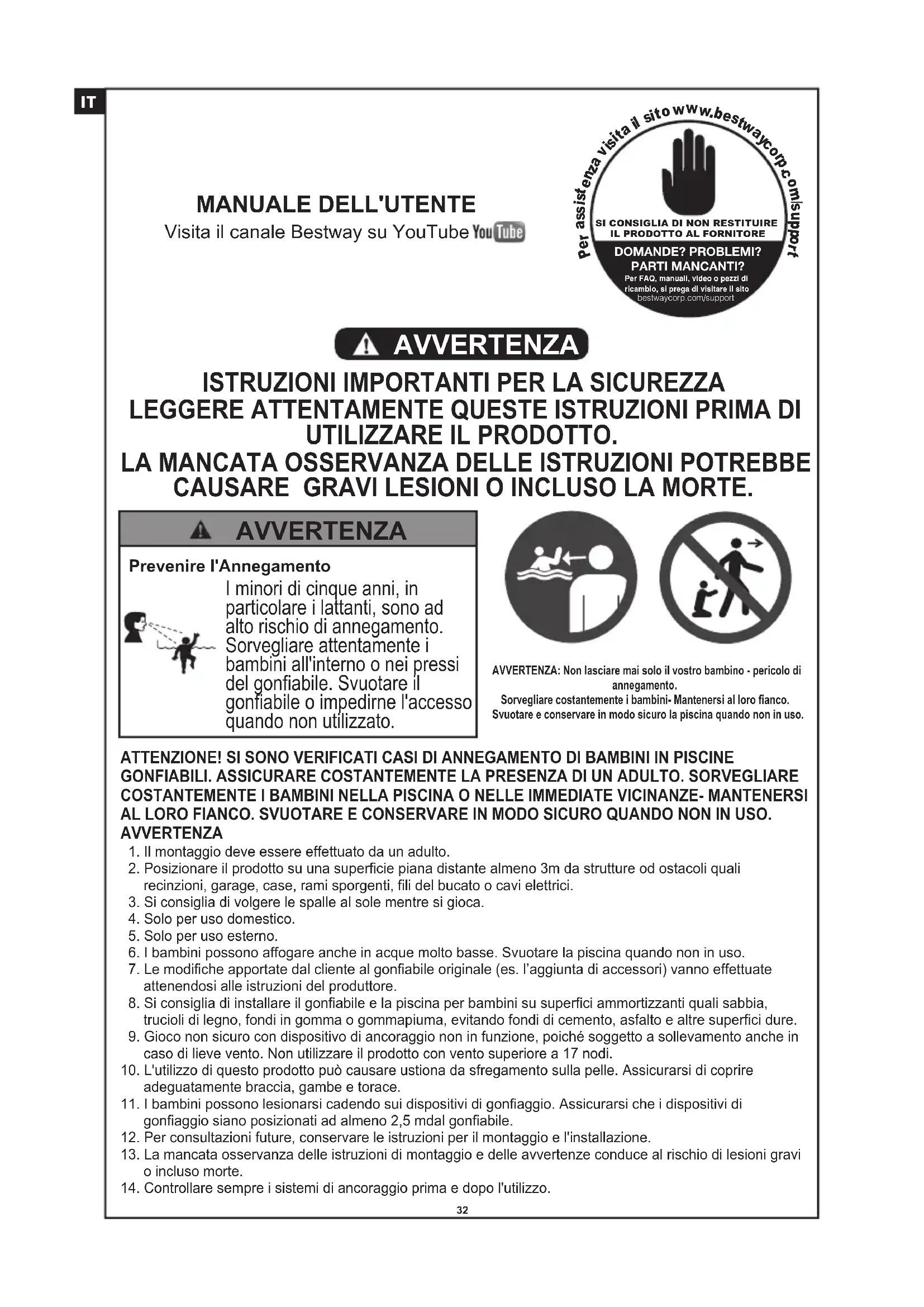 CAUSARE GRAVI LESIONI O INCLUSO LA MORTE. AVVERTENZA Prevenire l'Annegamento I minori di cinque anni, in particolare i lattanti, sono ad alto rischio di annegamento. Sorvegliare attentamente i bambini all'interno o nei pressi del gonfiabile. Svuotare il gonfiabile o impedirne l'accesso quando non utilizzato. AVVERTENZA AVVERTENZA: Non lasciare mai solo il vostro bambino - pericolo di annegamento.Sorvegliare costantemente i bambini- Mantenersi al loro fianco. Svuotare e conservare in modo sicuro la piscina quando non in uso.ATTENZIONE! SI SONO VERIFICATI CASI DI ANNEGAMENTO DI BAMBINI IN PISCINE GONFIABILI. ASSICURARE COSTANTEMENTE LA PRESENZA DI UN ADULTO. SORVEGLIARE COSTANTEMENTE I BAMBINI NELLA PISCINA O NELLE IMMEDIATE VICINANZE- MANTENERSI AL LORO FIANCO. SVUOTARE E CONSERVARE IN MODO SICURO QUANDO NON IN USO.AVVERTENZA 1. Il montaggio deve essere effettuato da un adulto. 2. Posizionare il prodotto su una superficie piana distante almeno 3m da strutture od ostacoli quali recinzioni, garage, case, rami sporgenti, fili del bucato o cavi elettrici. 3. Si consiglia di volgere le spalle al sole mentre si gioca. 4. Solo per uso domestico. 5. Solo per uso esterno. 6. I bambini possono affogare anche in acque molto basse. Svuotare la piscina quando non in uso. 7. Le modifiche apportate dal cliente al gonfiabile originale (es. l’aggiunta di accessori) vanno effettuate attenendosi alle istruzioni del produttore. 8. Si consiglia di installare il gonfiabile e la piscina per bambini su superfici ammortizzanti quali sabbia, trucioli di legno, fondi in gomma o gommapiuma, evitando fondi di cemento, asfalto e altre superfici dure. 9. Gioco non sicuro con dispositivo di ancoraggio non in funzione, poiché soggetto a sollevamento anche in caso di lieve vento. Non utilizzare il prodotto con vento superiore a 17 nodi.10. L'utilizzo di questo prodotto può causare ustiona da sfregamento sulla pelle. Assicurarsi di coprire adeguatamente braccia, gambe e torace.11. I bambini possono lesionarsi cadendo sui dispositivi di gonfiaggio. Assicurarsi che i dispositivi di gonfiaggio siano posizionati ad almeno 2,5 mdal gonfiabile.12. Per consultazioni future, conservare le istruzioni per il montaggio e l'installazione.13. La mancata osservanza delle istruzioni di montaggio e delle avvertenze conduce al rischio di lesioni gravi o incluso morte. 14. Controllare sempre i sistemi di ancoraggio prima e dopo l'utilizzo.