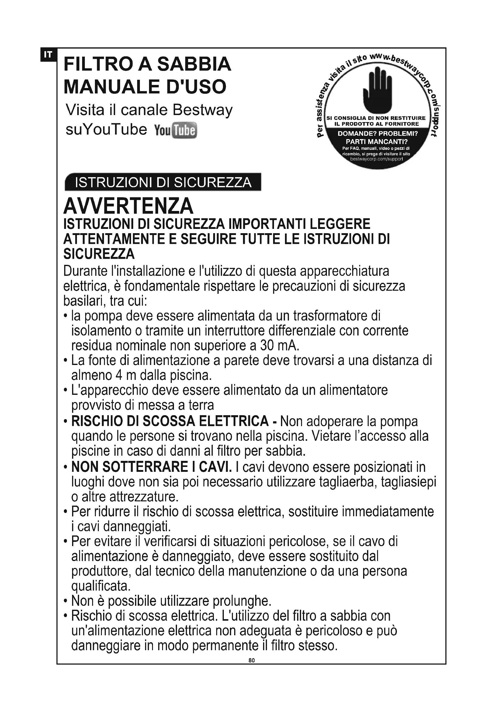 DOMANDE? PROBLEMI? PARTI MANCANTI? Per FAQ, manuali, video o pezzi di ricambio, si prega di visitare il sito bestwaycorp.com/supportDurante l'installazione e l'utilizzo di questa apparecchiatura elettrica, è fondamentale rispettare le precauzioni di sicurezza basilari, tra cui: