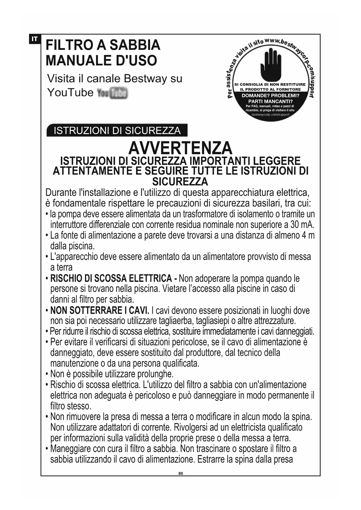 DOMANDE? PROBLEMI? PARTI MANCANTI? Per FAQ, manuali, video o pezzi di ricambio, si prega di visitare il sito bestwaycorp.com/support81 senza tirare bruscamente il cavo di alimentazione. Evitare la formazione di abrasioni sul cavo di alimentazione. Tenere il filtro a sabbia lontano da oggetti appuntiti, olio combustibile, parti mobili o fonti di calore.