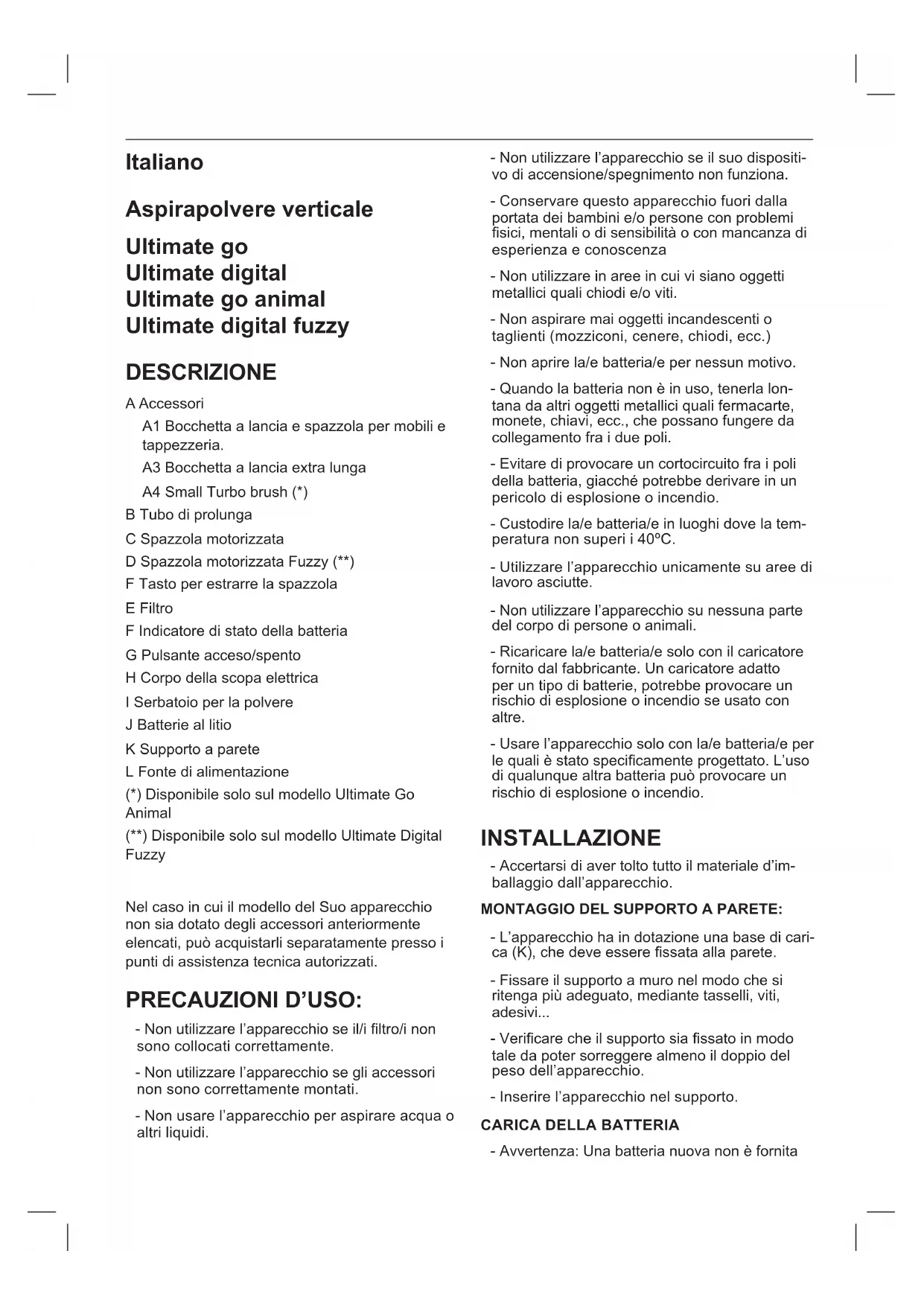 VERFAHREN SIE WIE FOLGT: - Öffnen Sie das obere Gehäuse des Gerätes, indem Sie mithilfe eines Schraubenziehers die Befestigungsschrauben abschrauben (Fig.7). - Nun können Sie ohne Gefahr die Batterie aus dem Fach nehmen.Italiano Aspirapolvere verticale Ultimate go Ultimate digital Ultimate go animal Ultimate digital fuzzy DESCRIZIONE A Accessori A1 Bocchetta a lancia e spazzola per mobili e tappezzeria. A3 Bocchetta a lancia extra lunga A4 Small Turbo brush (*) B Tubo di prolunga C Spazzola motorizzata D Spazzola motorizzata Fuzzy (**) F Tasto per estrarre la spazzola E Filtro F Indicatore di stato della batteria G Pulsante acceso/spento H Corpo della scopa elettrica I Serbatoio per la polvere J Batterie al litio K Supporto a parete L Fonte di alimentazione (*) Disponibile solo sul modello Ultimate Go Animal (**) Disponibile solo sul modello Ultimate Digital Fuzzy Nel caso in cui il modello del Suo apparecchio non sia dotato degli accessori anteriormente elencati, può acquistarli separatamente presso i punti di assistenza tecnica autorizzati. PRECAUZIONI D’USO: - Non utilizzare l’apparecchio se il/i ltro/i non sono collocati correttamente. - Non utilizzare l’apparecchio se gli accessori non sono correttamente montati. - Non usare l’apparecchio per aspirare acqua o altri liquidi. - Non utilizzare l’apparecchio se il suo dispositi- vo di accensione/spegnimento non funziona. - Conservare questo apparecchio fuori dalla portata dei bambini e/o persone con problemi sici, mentali o di sensibilità o con mancanza di esperienza e conoscenza - Non utilizzare in aree in cui vi siano oggetti metallici quali chiodi e/o viti. - Non aspirare mai oggetti incandescenti o taglienti (mozziconi, cenere, chiodi, ecc.) - Non aprire la/e batteria/e per nessun motivo. - Quando la batteria non è in uso, tenerla lon- tana da altri oggetti metallici quali fermacarte, monete, chiavi, ecc., che possano fungere da collegamento fra i due poli. - Evitare di provocare un cortocircuito fra i poli della batteria, giacché potrebbe derivare in un pericolo di esplosione o incendio. - Custodire la/e batteria/e in luoghi dove la tem- peratura non superi i 40ºC. - Utilizzare l’apparecchio unicamente su aree di lavoro asciutte. - Non utilizzare l’apparecchio su nessuna parte del corpo di persone o animali. - Ricaricare la/e batteria/e solo con il caricatore fornito dal fabbricante. Un caricatore adatto per un tipo di batterie, potrebbe provocare un rischio di esplosione o incendio se usato con altre. - Usare l’apparecchio solo con la/e batteria/e per le quali è stato specicamente progettato. L’uso di qualunque altra batteria può provocare un rischio di esplosione o incendio. INSTALLAZIONE - Accertarsi di aver tolto tutto il materiale d’im- ballaggio dall’apparecchio. MONTAGGIO DEL SUPPORTO A PARETE: - L’apparecchio ha in dotazione una base di cari- ca (K), che deve essere ssata alla parete. - Fissare il supporto a muro nel modo che si ritenga più adeguato, mediante tasselli, viti, adesivi... - Vericare che il supporto sia ssato in modo tale da poter sorreggere almeno il doppio del peso dell’apparecchio. - Inserire l’apparecchio nel supporto.