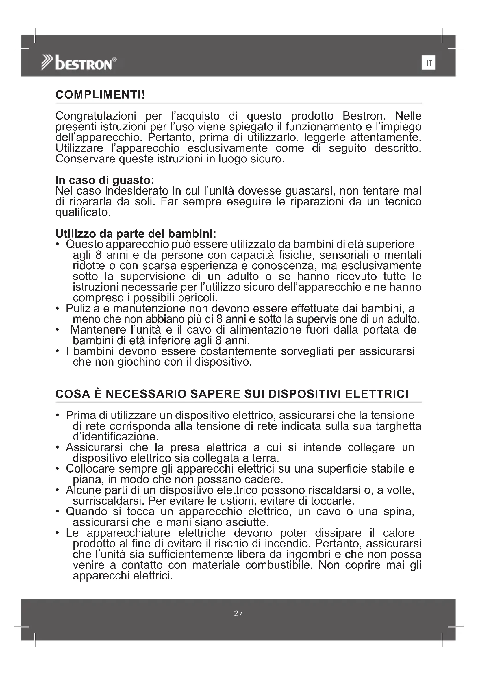 COMPLIMENTI! Congratulazioni per l’acquisto di questo prodotto Bestron. Nelle presenti istruzioni per l’uso viene spiegato il funzionamento e l’impiego dell’apparecchio. Pertanto, prima di utilizzarlo, leggerle attentamente. Utilizzare l’apparecchio esclusivamente come di seguito descritto. Conservare queste istruzioni in luogo sicuro. In caso di guasto: Nel caso indesiderato in cui l’unità dovesse guastarsi, non tentare mai di ripararla da soli. Far sempre eseguire le riparazioni da un tecnico qualificato. Utilizzo da parte dei bambini: