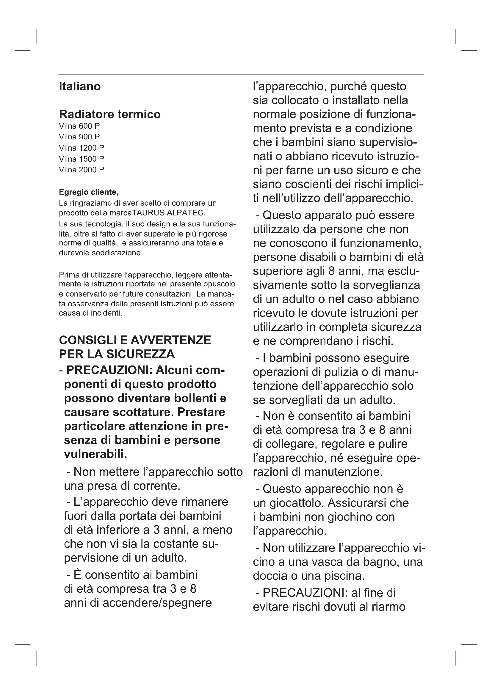 Mit Fernbedienungsoption Nein Mit adaptiver Regelung des Heizbeginns Nein Mit Betriebszeitbegrenzung Nein Mit Schwarzkugelsensor Nein Electrodomésticos Taurus, S.L. Avda. Barcelona, S/N, 25790 Oliana, lleida, SpainItaliano Radiatore termico Vilna 600 P Vilna 900 P Vilna 1200 P Vilna 1500 P Vilna 2000 P Egregio cliente, La ringraziamo di aver scelto di comprare un prodotto della marcaTAURUS ALPATEC. La sua tecnologia, il suo design e la sua funziona- lità, oltre al fatto di aver superato le più rigorose norme di qualità, le assicureranno una totale e durevole soddisfazione. Prima di utilizzare l’apparecchio, leggere attenta- mente le istruzioni riportate nel presente opuscolo e conservarlo per future consultazioni. La manca- ta osservanza delle presenti istruzioni può essere causa di incidenti.