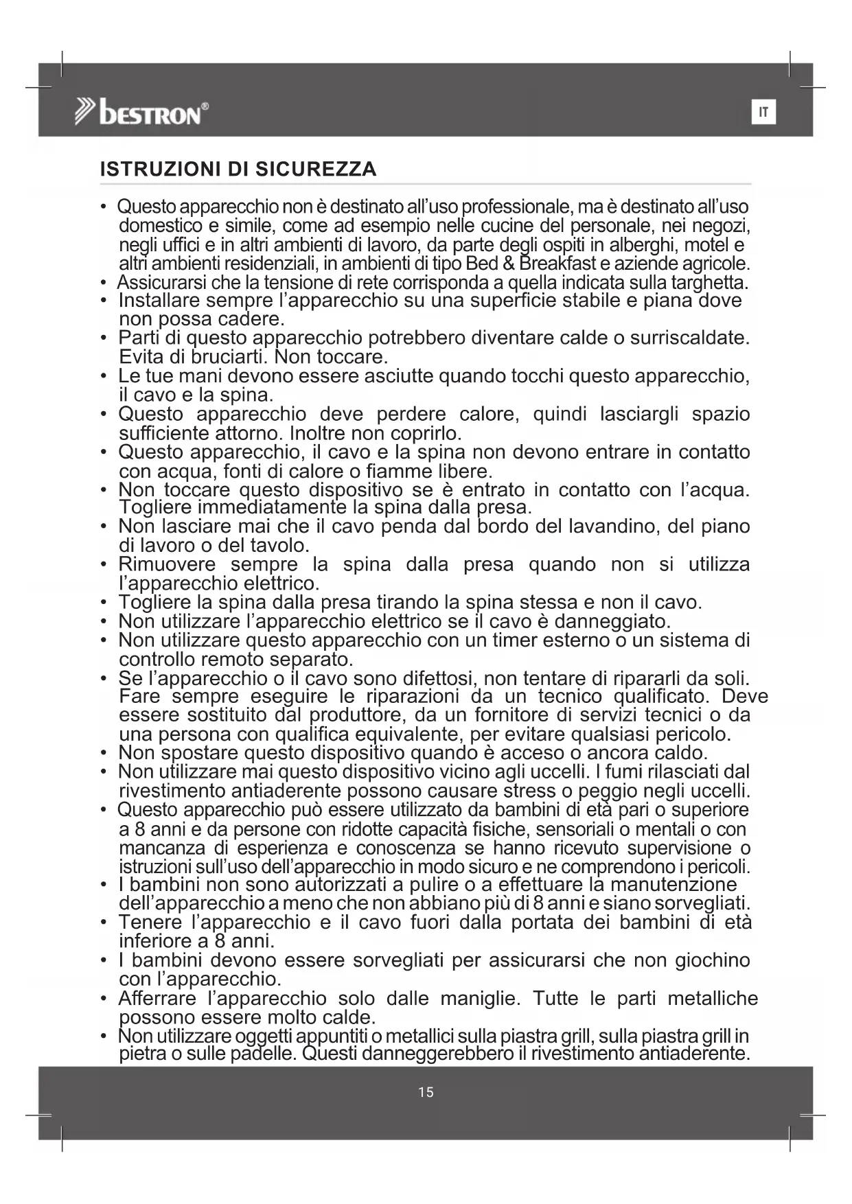 - Il tuo comune può dirti dove trovare il punto di raccolta dei riuti designato nel tuo quartiere. SERVIZIO Nell’improbabile eventualità di un malfunzionamento, contattare il ser- vizio clienti Bestron: www.bestron.com/service Specifiche tecniche Modello ARG1200CO Alimentazione (V) 220-240V Frequenza (Hz) 50/60 Classe di sicurezza 1 Energia (Watt) 1200-1400 Rumore (dB(A)) - Max. Capacità - Tempo massimo di funzionamento continuo (KB) - Dimensioni (Lar x Lun x H) (cm) 47,5x22,5x14 Lunghezza del cavo (cm) 10017