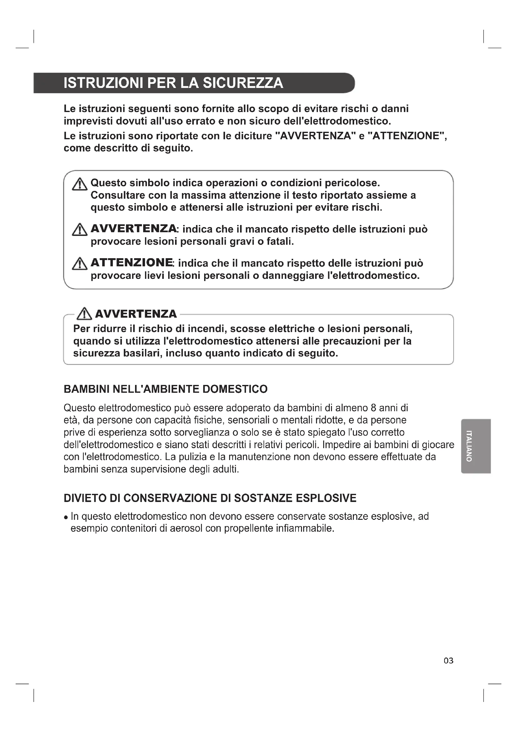 Le istruzioni seguenti sono fornite allo scopo di evitare rischi o danni imprevisti dovuti all'uso errato e non sicuro dell'elettrodomestico. Le istruzioni sono riportate con le diciture "AVVERTENZA" e "ATTENZIONE", come descritto di seguito. Questo simbolo indica operazioni o condizioni pericolose. Consultare con la massima attenzione il testo riportato assieme a questo simbolo e attenersi alle istruzioni per evitare rischi. AVVERTENZA : indica che il mancato rispetto delle istruzioni può provocare lesioni personali gravi o fatali. ATTENZIONE : indica che il mancato rispetto delle istruzioni può provocare lievi lesioni personali o danneggiare l'elettrodomestico. Per ridurre il rischio di incendi, scosse elettriche o lesioni personali, quando si utilizza l'elettrodomestico attenersi alle precauzioni per la sicurezza basilari, incluso quanto indicato di seguito. AVVERTENZA