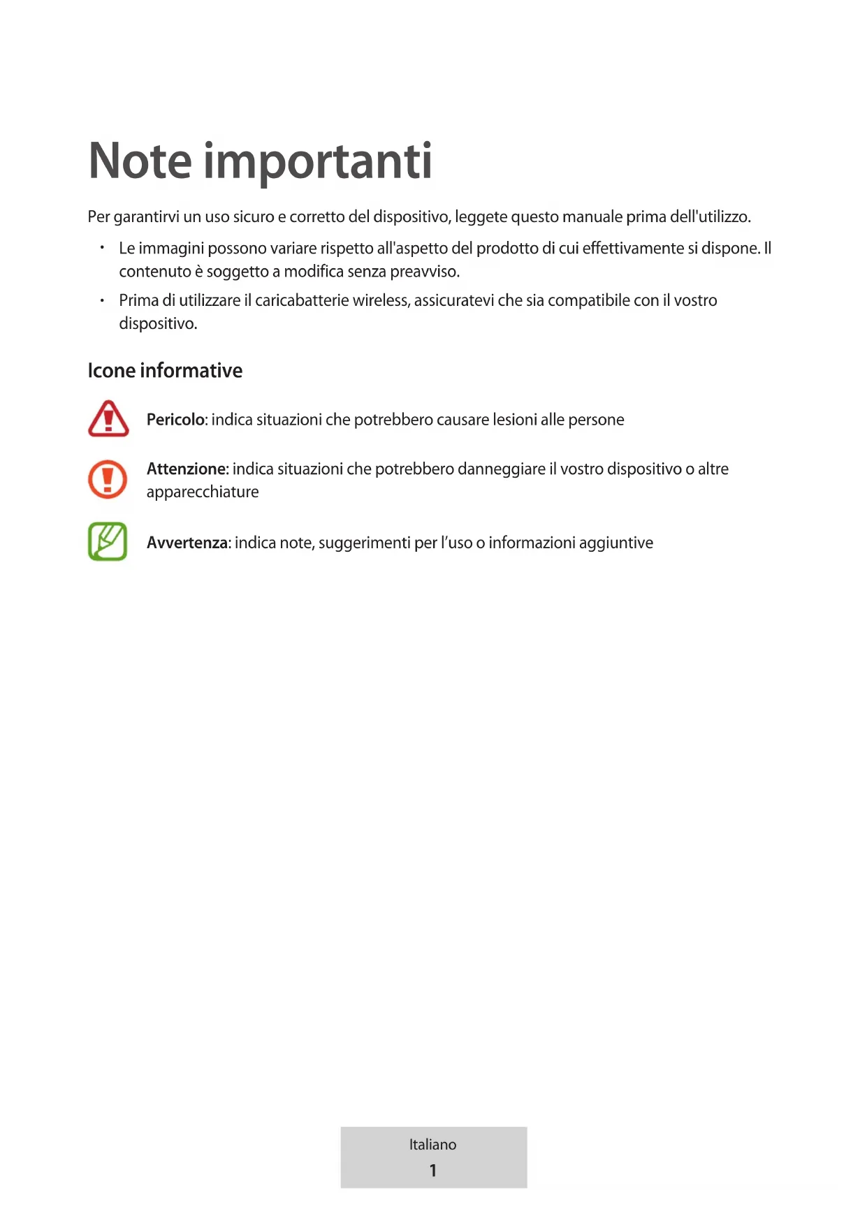 Prima di utilizzare il caricabatterie wireless, assicuratevi che sia compatibile con il vostro dispositivo. Icone informative Pericolo: indica situazioni che potrebbero causare lesioni alle persone Attenzione: indica situazioni che potrebbero danneggiare il vostro dispositivo o altre apparecchiature Avvertenza: indica note, suggerimenti per l’uso o informazioni aggiuntive2 Italiano Introduzione Contenuto della confezione Controllate che nella confezione siano presenti i seguenti elementi: