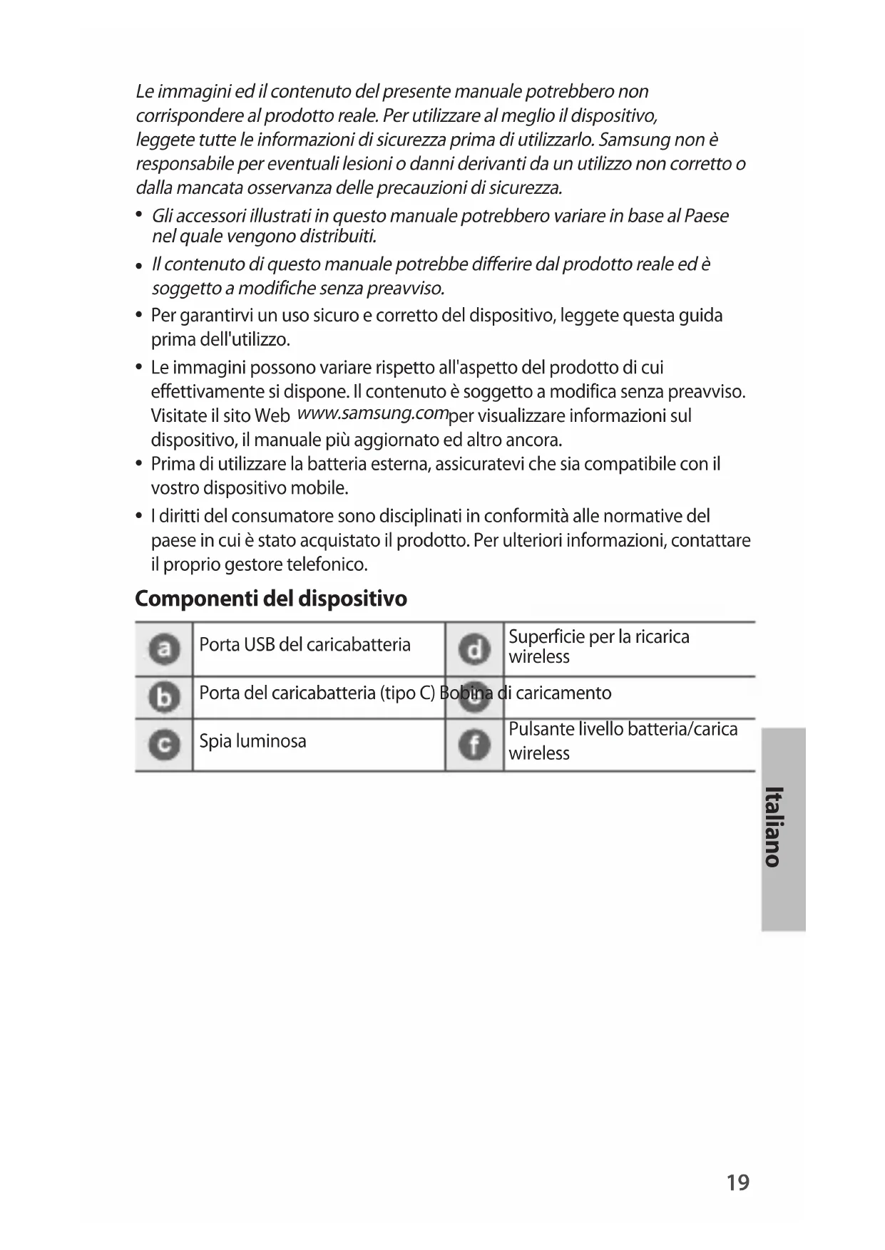- Prima di utilizzato la batteria esterna, assicuratevi che sua compatibile con il vosto dispositivo mobile.