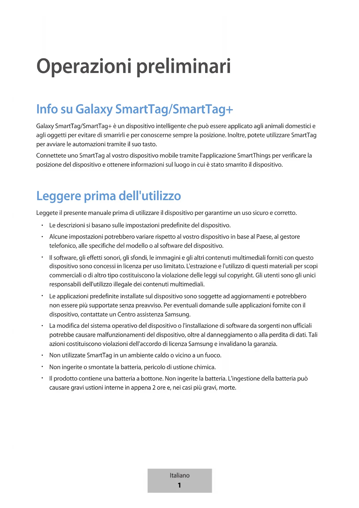 Operazioni preliminari Info su Galaxy SmartTag/SmartTag+ Galaxy SmartTag/SmartTag+ è un dispositivo intelligente che può essere applicato agli animali domestici e agli oggetti per evitare di smarrirli e per conoscerne sempre la posizione. Inoltre, potete utilizzare SmartTag per avviare le automazioni tramite il suo tasto. Connettete uno SmartTag al vostro dispositivo mobile tramite l'applicazione SmartThings per verificare la posizione del dispositivo e ottenere informazioni sul luogo in cui è stato smarrito il dispositivo. Leggere prima dell'utilizzo Leggete il presente manuale prima di utilizzare il dispositivo per garantirne un uso sicuro e corretto.