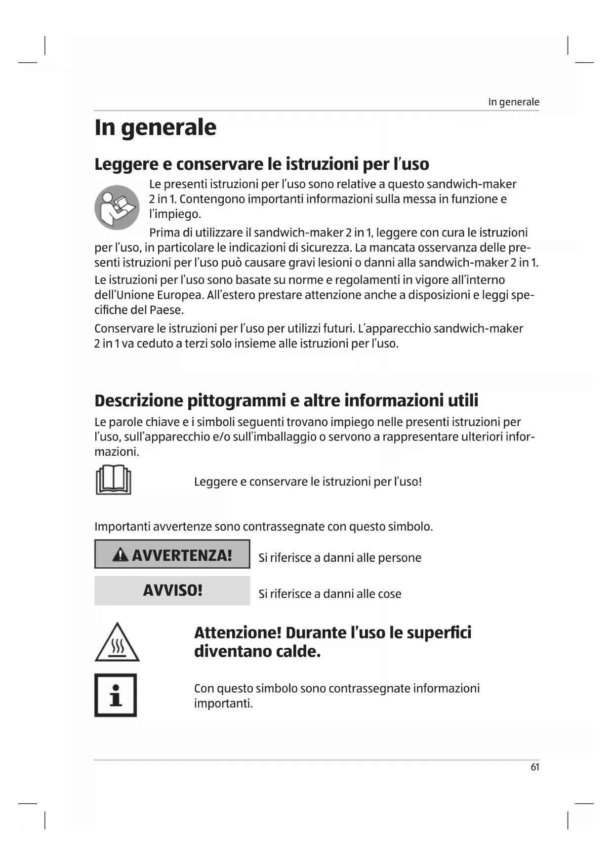 In generale/Sicurezza Dichiarazione di conformità (vedi il capitolo “Dichiarazioni di conformità”). I prodotti contrassegnati da questo simbolo soddisfano i requisiti delle direttive CE esistenti. ID 1111249401 Il sigillo “Geprüfte Sicherheit” (a norma di sicurezza) conferma che questo apparecchio è sicuro in caso di utilizzo prevedibile. L’apparecchio corrisponde ai requisiti della normativa tedesca sulla sicurezza dei prodotti. Questo viene documentato con la marcatura GS dell’istituto di controllo indipendente. Questo simbolo segnala le normative specifiche per lo smaltimen- to di vecchi apparecchi (vedi il capitolo “Smaltimento”). Sicurezza Utilizzo conforme alla destinazione d’uso Il sandwich-maker 2 in 1 è inteso esclusivamente per preparare waffel o toast per sandwich. Inoltre, l’apparecchio non è adat- to per l’uso commerciale, ma solo per l’uso in ambito privato; questo non comprende l’uso all’interno di cucine destinate ai dipendenti in negozi, uffici e altre zone commerciali, in te- nute agricole e l’utilizzo da parte dei clienti di hotel, motel e altre unità abitative e bed & breakfast. Qualsiasi altro utilizzo o modifica dell’apparecchio non è appropriata ed è in linea di principio proibita. Si declina ogni responsabilità per danni derivanti da utilizzo non appropriato o uso errato.6363 Sicurezza Note relative alla sicurezza AVVERTENZA! Leggere e osservare tutte le indicazioni per la sicurezza riportate di seguito. La mancata osservanza comporta notevoli rischi di incidenti e lesioni e il pericolo di danni materiali e all’apparecchio. Pericoli per bambini e persone con capacità limitate - L’apparecchio può essere utilizzato da bambini a partire dagli 8 anni e da persone con ridotte capacità fisiche, sensoriali o mentali o con scarsa esperienza e/o inesperte solo se sorve- gliati o informati in merito all‘uso sicuro dell‘apparecchio e avendo compreso i pericoli derivanti. - La pulizia e la manutenzione non devono essere eseguite dai bambini senza un’adeguata sorveglianza. L’apparec- chio e la sua linea di collegamento vanno tenuti fuori dalla portata dei bambini più piccoli di 8anni. - I bambini non devono giocare con l’apparecchio. I bambini non conoscono i pericoli che possono derivare dall’uso di apparecchi elettrici. Per questo motivo l’apparecchio deve essere usato e conservato lontano dalla portata dei bambi- ni di età inferiore a 8anni. Non lasciar penzolare il cavo di alimentazione per evitare di inciamparvi. - Tenere il materiale di imballaggio fuori dalla portata dei bambini. Pericolo di soffocamento!64 Sicurezza Pericoli durante l’uso degli apparecchi elettrici - Collegare l’apparecchio solo a una presa di corrente con contatto di terra installata a norma, con tensione di rete come da targhetta identificativa. - In caso di danneggiamento del cavo di alimentazione, la sostituzione deve essere effettuata esclusivamente da un laboratorio specializzato indicato dal produttore per evitare pericoli di lesioni e incidenti nonché danni all’apparecchio. - Assicurarsi che la presa si trovi nelle immediate vicinanze dell’apparecchio e sia liberamente accessibile per poter staccare rapidamente l’apparecchio dalla rete in caso di interferenze. - Le riparazioni devono essere eseguite solo da laboratori specializzati e autorizzati. Le apparecchiature non riparate a regola d’arte sono pericolose per chi le utilizza. - Per evitare incidenti tenere sempre sotto controllo l’apparecchio quando è in funzione. - Per evitare incidenti, non collegare mai più elettrodomestici contemporaneamente (ad es. tramite una presa tripla) alla stessa presa con contatto di terra. - Non immergere mai l’apparecchio nell’acqua e non usarlo all’aperto, in quanto non può essere esposto alla pioggia né ad altro genere di umidità. Pericolo di scossa elettrica! - Se l’apparecchio dovesse cadere nell’acqua, staccare per prima cosa la spina ed estrarre l’apparecchio dall’acqua! Dopodiché non rimettere in funzione l’apparecchio, ma farlo prima controllare da un centro di assistenza autoriz- zato. Ciò vale anche in caso di danneggiamento del cavo di alimentazione o dell’apparecchio e di caduta dell’apparec- chio. Pericolo di scossa elettrica! - Staccare sempre la spina dalla presa di corrente quando non si usa l’apparecchio e prima di qualsiasi operazione di65 Sicurezza pulizia o in caso di problemi nel funzionamento! Non tirare mai il cavo di alimentazione! Pericolo di scossa elettrica! - Fare attenzione a che il cavo di alimentazione o l’apparec- chio non siano mai collocati su superfici calde o in prossi- mità di fonti di calore. Sistemare il cavo di alimentazione in modo che non entri in contatto con oggetti bollenti o affila- ti. Pericolo di scossa elettrica! - Non piegare assolutamente il cavo di alimentazione, questo può infatti causarne la rottura. Pericolo di scossa elettrica! - Non usare l’apparecchio sul pavimento bagnato o con le mani bagnate o se l’apparecchio stesso è umido. Pericolo di scossa elettrica! - Non aprire mai l’apparecchio e non cercare in alcun modo di raggiungerne l’interno con oggetti metallici. Pericolo di scossa elettrica! Pericoli durante l’uso del sandwich-maker 2 in 1 - Durante il funzionamento di riscaldatori elettrici si sviluppano temperature molto elevate, che possono causare ustioni (ad esempio piastre di cottura o stampi e alloggiamento). Non toccare mai le superfici calde a mani nude! Utilizzare quindi le maniglie previste e indossare sempre guanti da cucina termoisolanti. Avvertire dei pericoli anche gli altri utilizzatori. Pericolo di lesioni! - Lasciar raffreddare completamente l’apparecchio prima di pulirlo e/o di riporlo. Vi ricordiamo che l’apparecchio può essere ancora molto caldo anche dopo lo spegnimento. Pericolo di ustioni! - Assicurarsi che l’apparecchio sia disposto su una base an- tiscivolo e resistente al calore. Per evitare un a