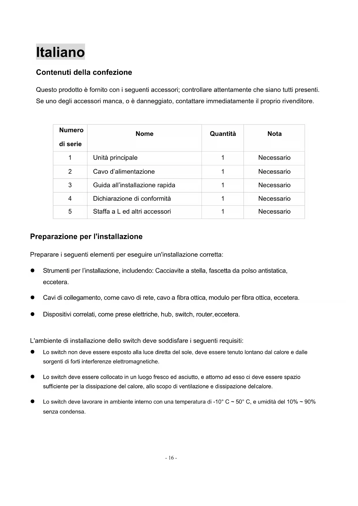 Preparazione per l'installazione Preparare i seguenti elementi per eseguire un'installazione corretta: l Strumenti per l’installazione, includendo: Cacciavite a stella, fascetta da polso antistatica, eccetera. l Cavi di collegamento, come cavo di rete, cavo a fibra ottica, modulo per fibra ottica, eccetera. l Dispositivi correlati, come prese elettriche, hub, switch, router, eccetera. L'ambiente di installazione dello switch deve soddisfare i seguenti requisiti: l Lo switch non deve essere esposto alla luce diretta del sole, deve essere tenuto lontano dal calore e dalle sorgenti di forti interferenze elettromagnetiche. l Lo switch deve essere collocato in un luogo fresco ed asciutto, e attorno ad esso ci deve essere spazio sufficiente per la dissipazione del calore, allo scopo di ventilazione e dissipazione del calore. l Lo switch deve lavorare in ambiente interno con una temperatura di -10° C ~ 50° C, e umidità del 10% ~ 90% senza condensa.- 17 - Attrezzature di installazione