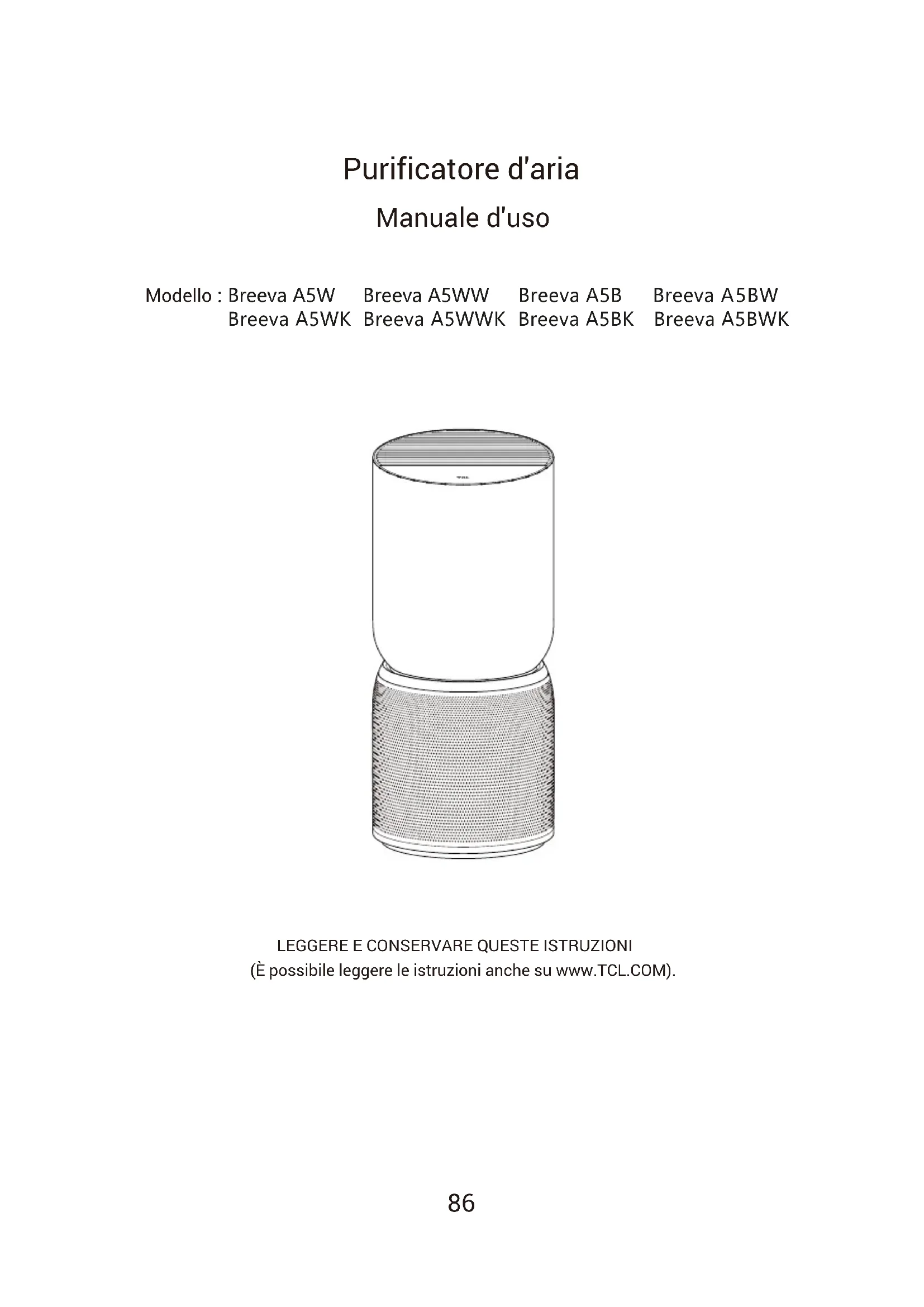 Breeva A5WWK - Purificatore d'aria TCL - Manuale utente e istruzioni gratuiti