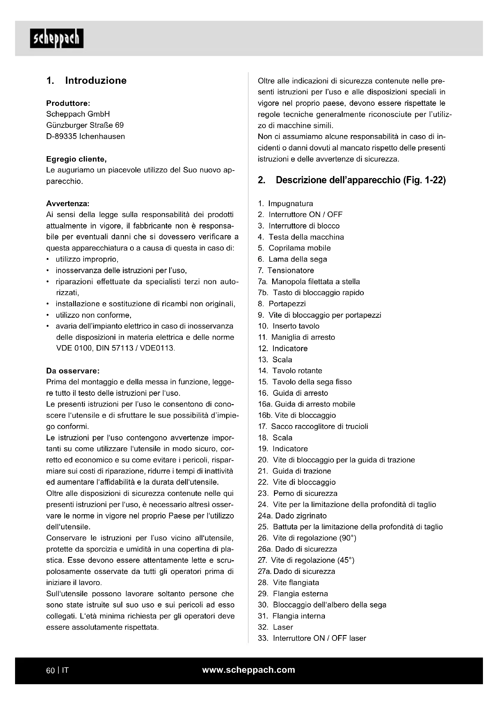 - avaria dell’impianto elettrico in caso di inosservanza delle disposizioni in materia elettrica e delle norme VDE 0100, DIN 57113 / VDE0113. Da osservare: Prima del montaggio e della messa in funzione, legge- re tutto il testo delle istruzioni per l‘uso. Le presenti istruzioni per l’uso le consentono di cono- scere l‘utensile e di sfruttare le sue possibilità d’impie- go conformi. Le istruzioni per l‘uso contengono avvertenze impor- tanti su come utilizzare l‘utensile in modo sicuro, cor- retto ed economico e su come evitare i pericoli, rispar- miare sui costi di riparazione, ridurre i tempi di inattività ed aumentare l‘adabilità e la durata dell‘utensile. Oltre alle disposizioni di sicurezza contenute nelle qui presenti istruzioni per l‘uso, è necessario altresì osser- vare le norme in vigore nel proprio Paese per l‘utilizzo dell‘utensile. Conservare le istruzioni per l’uso vicino all‘utensile, protette da sporcizia e umidità in una copertina di pla- stica. Esse devono essere attentamente lette e scru- polosamente osservate da tutti gli operatori prima di iniziare il lavoro. Sull‘utensile possono lavorare soltanto persone che sono state istruite sul suo uso e sui pericoli ad esso collegati. L‘età minima richiesta per gli operatori deve essere assolutamente rispettata.www.scheppach.com
