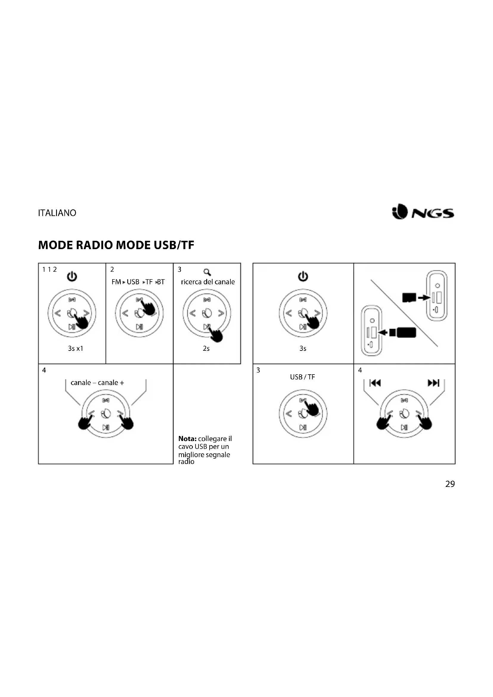 canale – canale + Nota: collegare il cavo USB per un migliore segnale radio