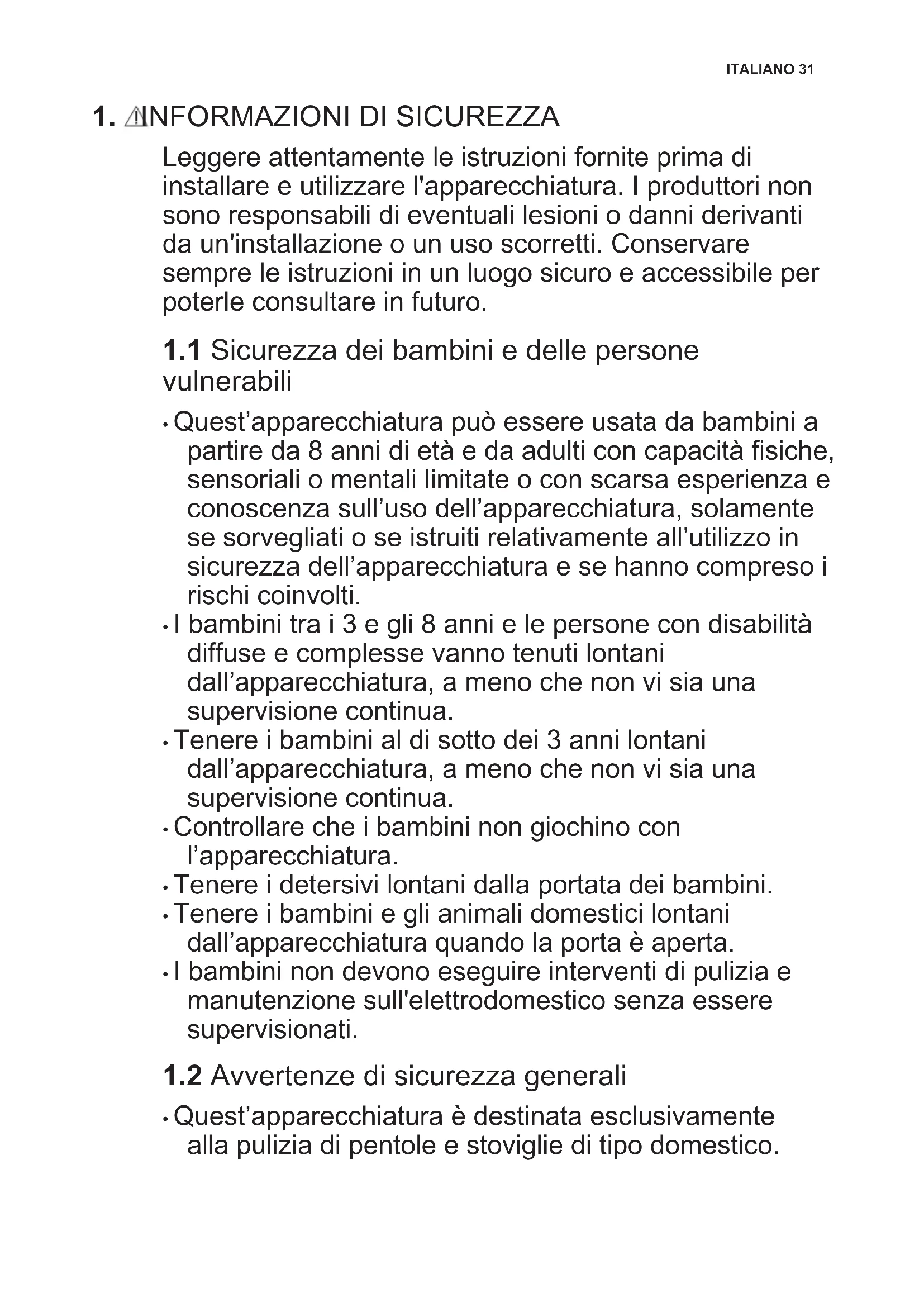 - Quest’apparecchiatura è destinata esclusivamente alla pulizia di pentole e stoviglie di tipo domestico. ITALIANO 31• Quest’apparecchiatura è progettata per un uso domestico singolo in un ambiente interno.