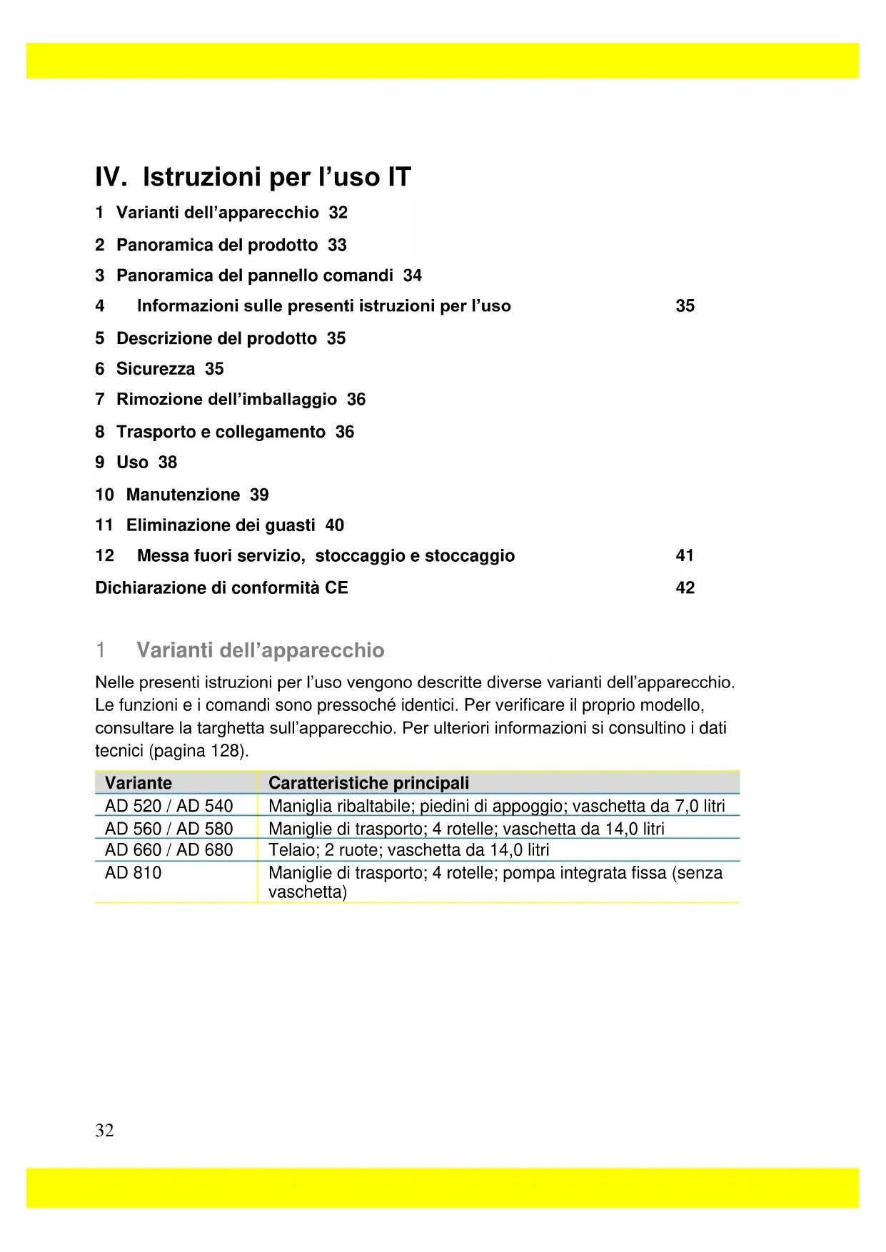 1 Varianti dell’apparecchio 32 2 Panoramica del prodotto 33 3 Panoramica del pannello comandi 34 4 Informazioni sulle presenti istruzioni per l’uso 35 5 Descrizione del prodotto 35 6 Sicurezza 35 7 Rimozione dell’imballaggio 36 8 Trasporto e collegamento 36 9 Uso 38 10 Manutenzione 39 11 Eliminazione dei guasti 40 12 Messa fuori servizio, stoccaggio e stoccaggio 41 Dichiarazione di conformità CE 42 1 Varianti dell’apparecchio Nelle presenti istruzioni per l’uso vengono descritte diverse varianti dell’apparecchio. Le funzioni e i comandi sono pressoché identici. Per verificare il proprio modello, consultare la targhetta sull’apparecchio. Per ulteriori informazioni si consultino i dati tecnici (pagina 128). Variante Caratteristiche principali AD 520 / AD 540 Maniglia ribaltabile; piedini di appoggio; vaschetta da 7,0 litri AD 560 / AD 580 Maniglie di trasporto; 4 rotelle; vaschetta da 14,0 litri AD 660 / AD 680 Telaio; 2 ruote; vaschetta da 14,0 litri AD 810 Maniglie di trasporto; 4 rotelle; pompa integrata fissa (senza vaschetta)33 2 Panoramica del prodotto