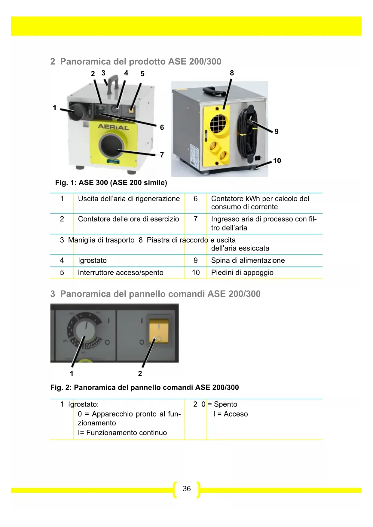 Fig. 2: Panoramica del pannello comandi ASE 200/300 1 Igrostato: 0 = Apparecchio pronto al fun- zionamento I= Funzionamento continuo 2 0 = Spento I = Acceso