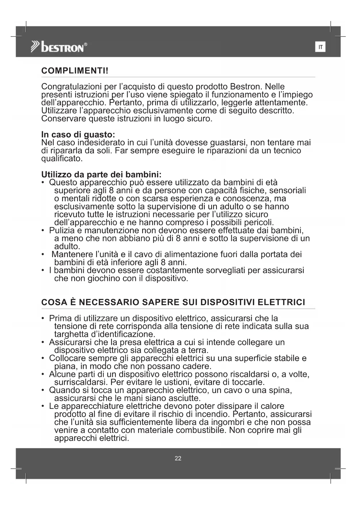 ENCOMPLIMENTI! Congratulazioni per l’acquisto di questo prodotto Bestron. Nelle presenti istruzioni per l’uso viene spiegato il funzionamento e l’impiego dell’apparecchio. Pertanto, prima di utilizzarlo, leggerle attentamente. Utilizzare l’apparecchio esclusivamente come di seguito descritto. Conservare queste istruzioni in luogo sicuro. In caso di guasto: Nel caso indesiderato in cui l’unità dovesse guastarsi, non tentare mai di ripararla da soli. Far sempre eseguire le riparazioni da un tecnico qualificato. Utilizzo da parte dei bambini: