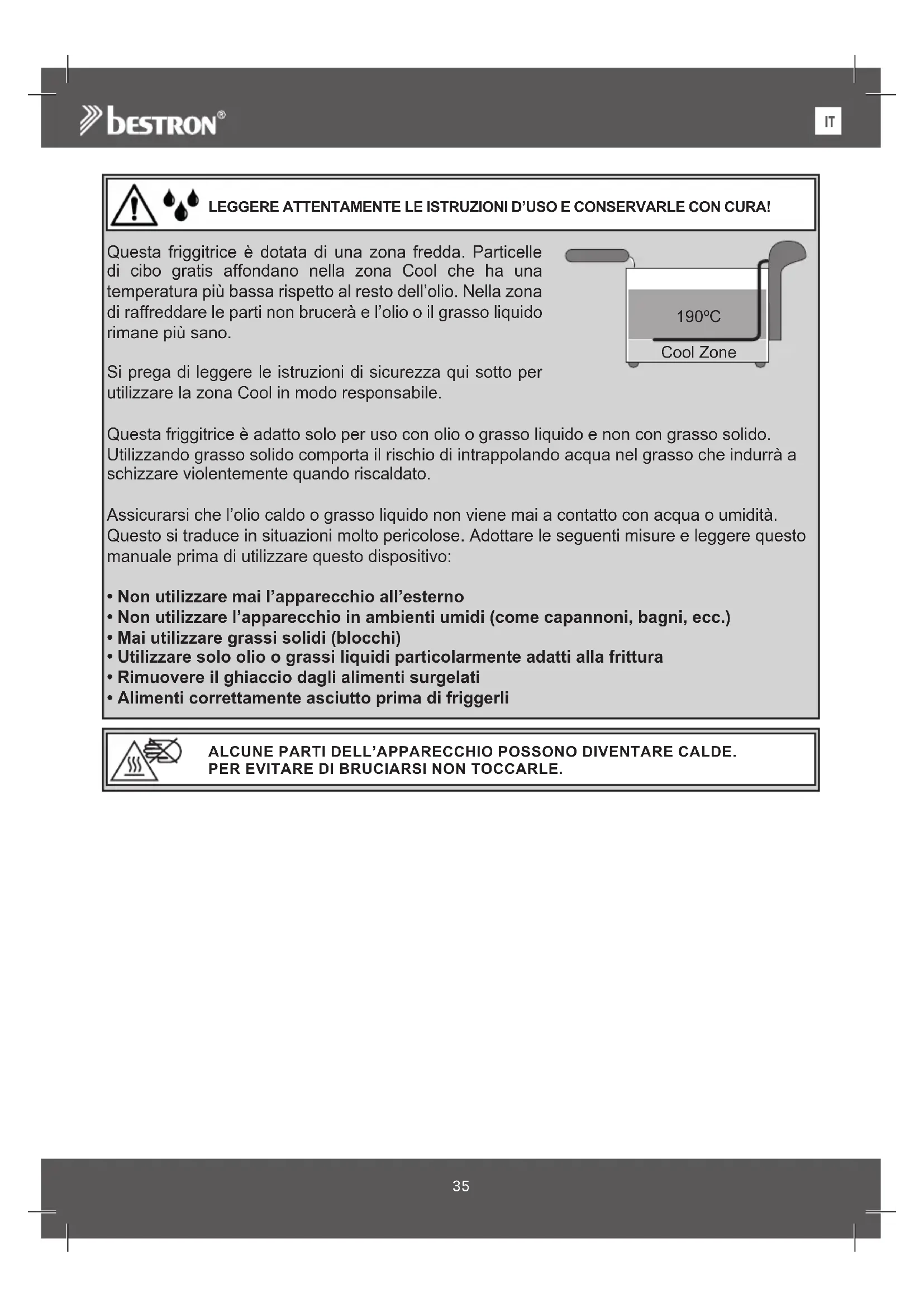 LEGGERE ATTENTAMENTE LE ISTRUZIONI D’USO E CONSERVARLE CON CURA! ALCUNE PARTI DELL’APPARECCHIO POSSONO DIVENTARE CALDE. PER EVITARE DI BRUCIARSI NON TOCCARLE. 190ºC Cool Zone Questa friggitrice è dotata di una zona fredda. Particelle di cibo gratis affondano nella zona Cool che ha una temperatura più bassa rispetto al resto dell’olio. Nella zona di raffreddare le parti non brucerà e l’olio o il grasso liquido rimane più sano. Si prega di leggere le istruzioni di sicurezza qui sotto per utilizzare la zona Cool in modo responsabile. Questa friggitrice è adatto solo per uso con olio o grasso liquido e non con grasso solido. Utilizzando grasso solido comporta il rischio di intrappolando acqua nel grasso che indurrà a schizzare violentemente quando riscaldato. Assicurarsi che l’olio caldo o grasso liquido non viene mai a contatto con acqua o umidità. Questo si traduce in situazioni molto pericolose. Adottare le seguenti misure e leggere questo manuale prima di utilizzare questo dispositivo: