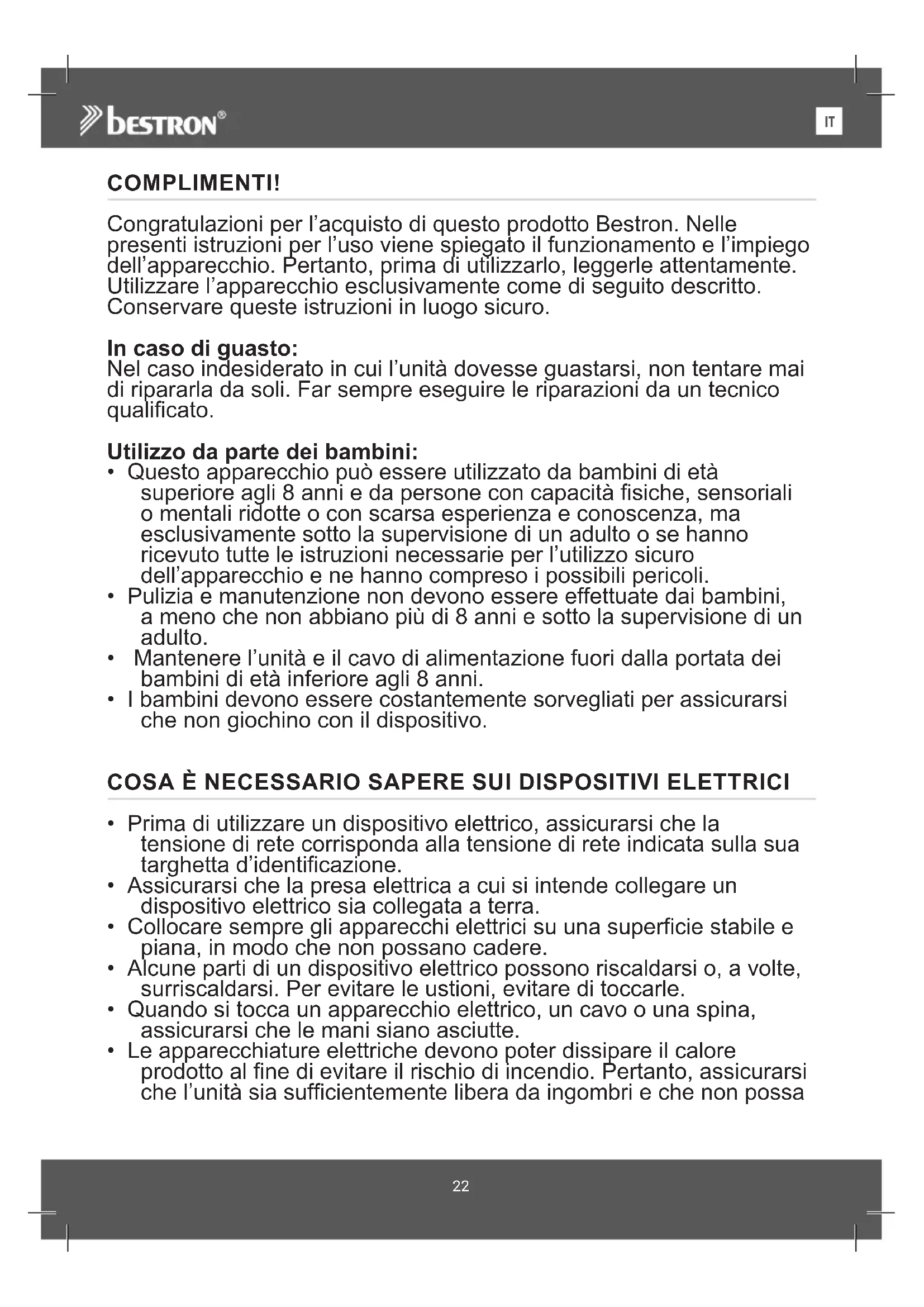 ENCOMPLIMENTI! Congratulazioni per l’acquisto di questo prodotto Bestron. Nelle presenti istruzioni per l’uso viene spiegato il funzionamento e l’impiego dell’apparecchio. Pertanto, prima di utilizzarlo, leggerle attentamente. Utilizzare l’apparecchio esclusivamente come di seguito descritto. Conservare queste istruzioni in luogo sicuro. In caso di guasto: Nel caso indesiderato in cui l’unità dovesse guastarsi, non tentare mai di ripararla da soli. Far sempre eseguire le riparazioni da un tecnico qualificato. Utilizzo da parte dei bambini: