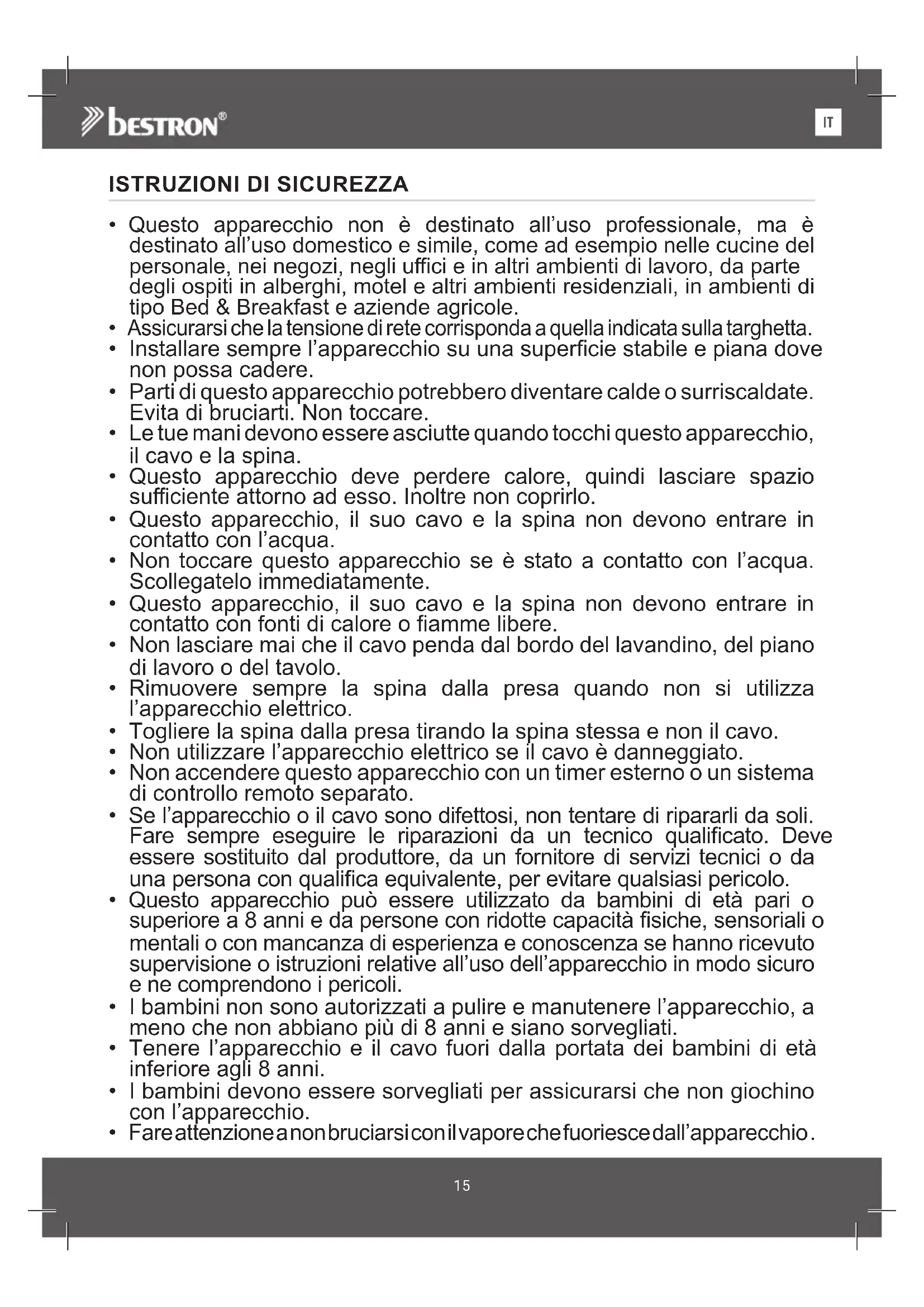 - Il tuo comune può dirti dove trovare il punto di raccolta dei riuti designato nel tuo quartiere. SERVIZIO Nell’improbabile eventualità di un malfunzionamento, contattare il ser- vizio clienti Bestron: www.bestron.com/service Specifiche tecniche Modello AWK2200BW Alimentazione 220-240V Frequenza (Hz) 50-60 Classe di sicurezza 1 Energia (Watt) 1850-2200 Rumore (dB(A)) - Max. Capacità - Tempo massimo di funzionamento continuo (KB) - Dimensioni (Lar x Lun x H) (cm) 23,2x16,1x23,9 Lunghezza del cavo (cm) 7017