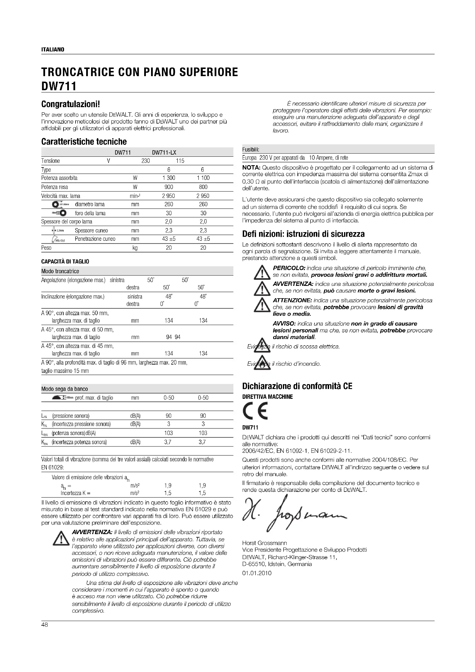 DW711 È necessario identificare ulteriori misure di sicurezza per proteggere l’operatore dagli effetti delle vibrazioni. Per esempio: eseguire una manutenzione adeguata dell’apparato e degli accessori, evitare il raffreddamento delle mani, organizzare il lavoro. Fusibili: Europa 230 V per apparati da 10 Ampere, di rete NOTA: Questo dispositivo è progettato per il collegamento ad un sistema di corrente elettrica con impedenza massima del sistema consentita Zmax di 0,30 Ω al punto dell’interfaccia (scatola di alimentazione) dell’alimentazione dell’utente. L’utente deve assicurarsi che questo dispositivo sia collegato solamente ad un sistema di corrente che soddisfi il requisito di cui sopra. Se necessario, l’utente può rivolgersi all’azienda di energia elettrica pubblica per l’impedenza del sistema al punto di interfaccia. Defi nizioni: istruzioni di sicurezza Le definizioni sottostanti descrivono il livello di allerta rappresentato da ogni parola di segnalazione. Si invita a leggere attentamente il manuale, prestando attenzione a questi simboli. PERICOLO: indica una situazione di pericolo imminente che, se non evitata, provoca lesioni gravi o addirittura mortali. AVVERTENZA: indica una situazione potenzialmente pericolosa che, se non evitata, può causare morte o gravi lesioni. ATTENZIONE: indica una situazione potenzialmente pericolosa che, se non evitata, potrebbe provocare lesioni di gravità lieve o media. AVVISO: indica una situazione non in grado di causare lesioni personali ma che, se non evitata, potrebbe provocare danni materiali. Evidenzia il rischio di scossa elettrica. Evidenzia il rischio d’incendio. Dichiarazione di conformità CE DIRETTIVA MACCHINE DW711 DEWALT dichiara che i prodotti qui descritti nei “Dati tecnici” sono conformi alle normative: 2006/42/EC, EN 61092-1, EN 61029-2-11. Questi prodotti sono anche conformi alle normative 2004/108/EC. Per ulteriori informazioni, contattare DEWALT all’indirizzo seguente o vedere sul retro del manuale. Il firmatario è responsabile della compilazione del documento tecnico e rende questa dichiarazione per conto di DEWALT. Horst Grossmann Vice Presidente Progettazione e Sviluppo Prodotti DEWALT, Richard-Klinger-Strasse 11, D-65510, Idstein, Germania