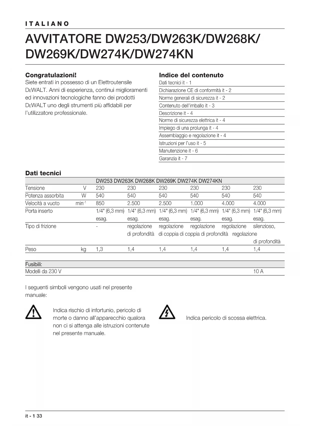 Porta inserto 1/4" (6,3 mm) 1/4" (6,3 mm) 1/4" (6,3 mm) 1/4" (6,3 mm) 1/4" (6,3 mm) 1/4" (6,3 mm) esag. esag. esag. esag. esag. esag. Tipo di frizione - regolazione regolazione regolazione regolazione silenzioso, di profondità di coppia di coppia di profondità regolazione di profondità Peso kg 1,3 1,4 1,4 1,4 1,4 1,4 Fusibili: Modelli da 230 V 10 A I seguenti simboli vengono usati nel presente manuale: Indica rischio di infortunio, pericolo di morte o danno all’apparecchio qualora non ci si attenga alle istruzioni contenute nel presente manuale. Indica pericolo di scossa elettrica.34 it - 2 ITALIANO Dichiarazione CE di conformità DW253/DW263K/DW268K/DW269K/DW274K/ DW274KN DEWALT dichiara che gli Elettroutensili sono stati costruiti in conformità alle norme: 89/392/CEE, 89/336/CEE, 73/23/CEE, EN 50144, EN 55104 / EN 55014-2, EN 55014, EN 61000-3-2 & EN 61000-3-3. Per ulteriori informazioni, contattare DEWALT nel indirizzo qui sotto o consultare il retro del presente manuale. Il livello di rumorosità è conforme alle norme 86/188/CEE e 89/392/CEE, dati ricavati in base alla norma EN 50144: DW253 DW263K DW268K DW269K DW274K DW274KN