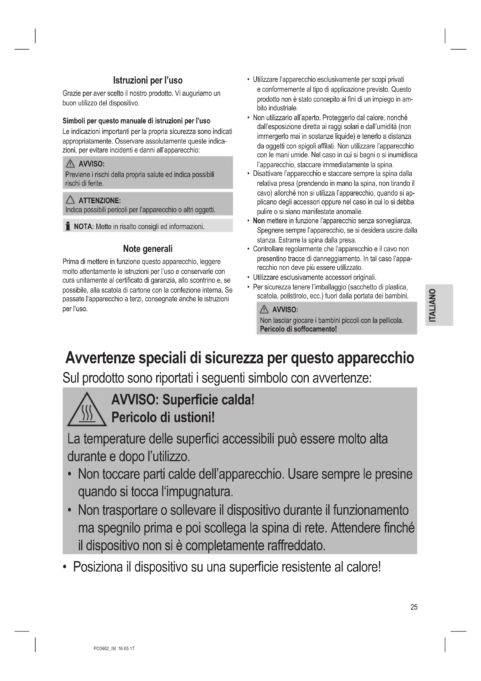 - Per sicurezza tenere l’imballaggio (sacchetto di plastica, scatola, polistirolo, ecc.) fuori dalla portata dei bambini. AVVISO: Non lasciar giocare i bambini piccoli con la pellicola. Pericolo di soffocamento! Avvertenze speciali di sicurezza per questo apparecchio Sul prodotto sono riportati i seguenti simbolo con avvertenze: AVVISO: Supercie calda! Pericolo di ustioni! La temperature delle superci accessibili può essere molto alta durante e dopo l’utilizzo.