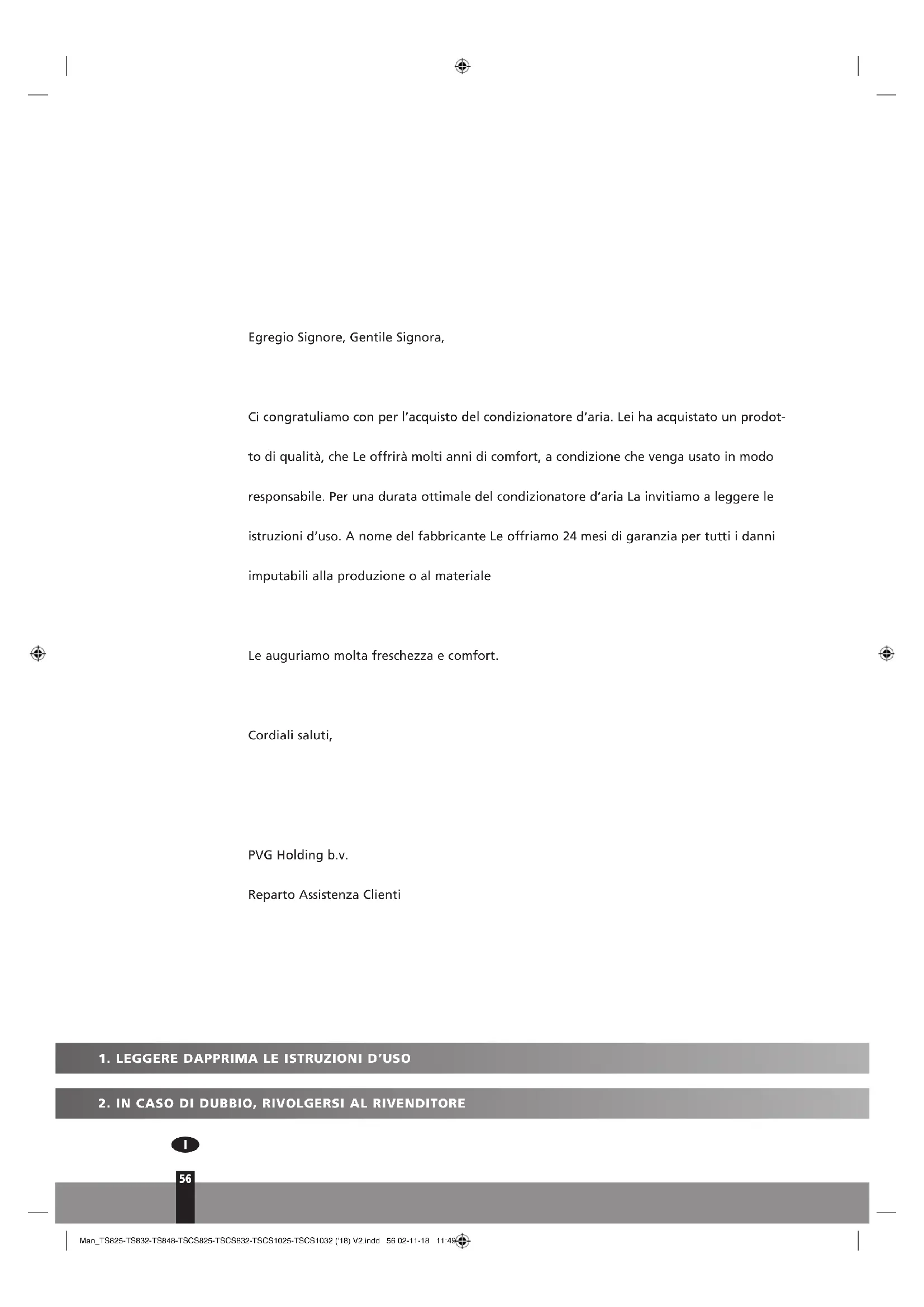Man_TS825-TS832-TS848-TSCS825-TSCS832-TSCS1025-TSCS1032 ('18) V2.indd 55 02-11-18 11:49Egregio Signore, Gentile Signora, Ci congratuliamo con per l’acquisto del condizionatore d’aria. Lei ha acquistato un prodot- to di qualità, che Le offrirà molti anni di comfort, a condizione che venga usato in modo responsabile. Per una durata ottimale del condizionatore d’aria La invitiamo a leggere le istruzioni d’uso. A nome del fabbricante Le offriamo 24 mesi di garanzia per tutti i danni imputabili alla produzione o al materiale Le auguriamo molta freschezza e comfort. Cordiali saluti, PVG Holding b.v. Reparto Assistenza Clienti