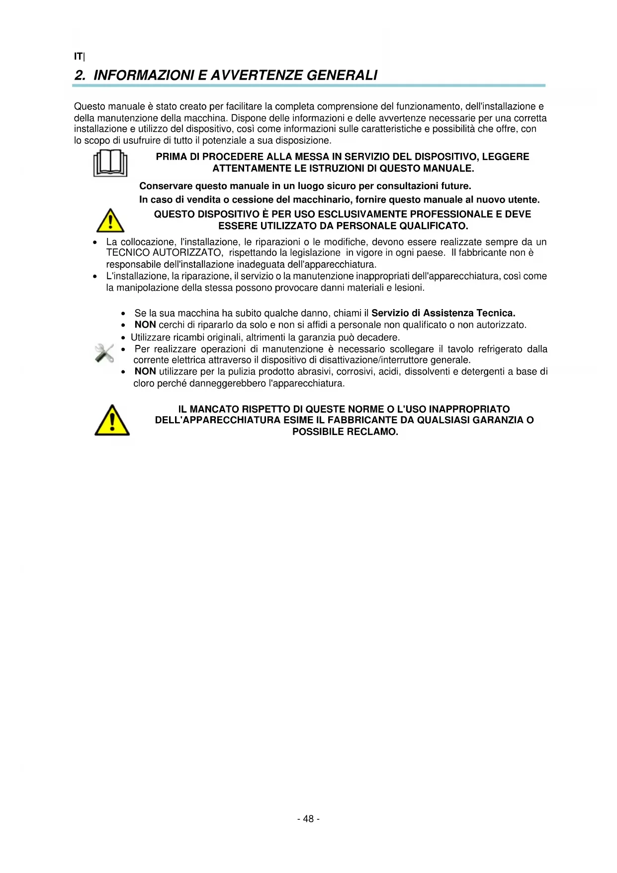Conservare quello manuale in un luogo sicuro per consulazioni future. In caso di vendita o cessione del macchinario, fornire quello manuale al nuovo utente. QUESTO DISPOSITIVO è PER USO ESCLUSIVAMENTE PROFESSIONALE E DEVE ESSERE UTILIZZATO DA PERSONALE QUALIFICATO.