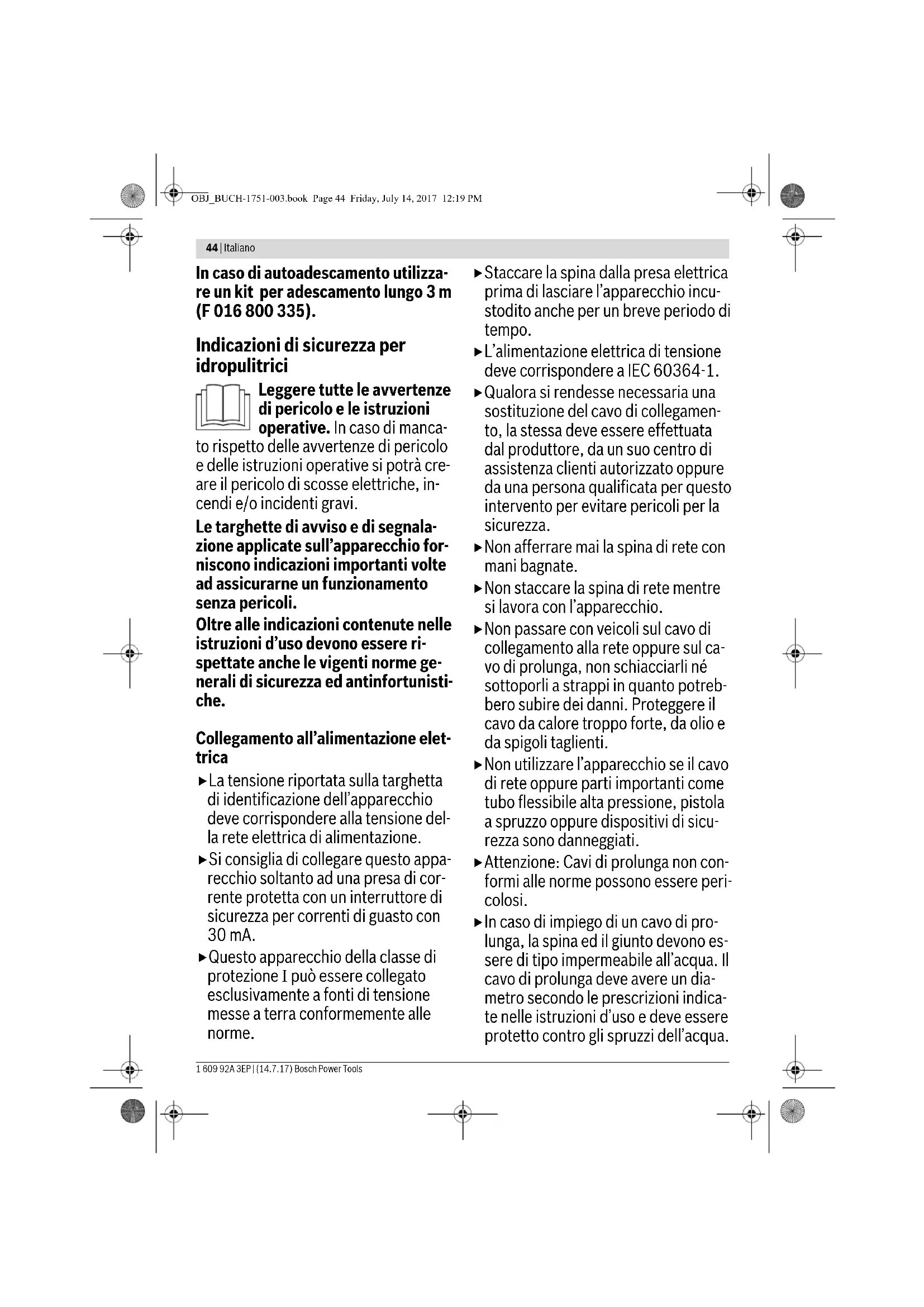 Mangueira de alta pressão muito longa Retirar a extensão da mangueira de alta pressão, máx. comprimento de manguei- ra de água de 7 m Pressão uniforme, mas baixa demais Nota: Um determinado acessório causa uma baixa pressão Bocal gasto Substituir o bocal Válvula de partida/parada está gasta Acionar o gatilho 5 vezes repetidamente O motor funciona, mas a pressão é limita- da ou não há pressão de trabalho Água não conectada Ligar a água Filtro obstruído Limpar o filtro Bocal obstruído Limpar o bocal O limpador de alta pressão arranca por conta própria Bomba ou pistola de pulverização não es- tão estanques Dirija-se a uma oficina de serviço pós- venda autorizada Bosch Aparelho não estanque Bomba não estanque Pequenas fugas de água são permitidas; em caso de maiores fugas deverá contac- tar o serviço pós-venda. O produto de limpeza não é aspirado O bocal ajustável se encontra na posição de alta pressão Colocar o bocal em “Lo” O produto de limpeza é muito tenaz Diluir com água A mangueira de alta pressão foi alongada. Conectar a mangueira original. Resíduos ou estreitamento no circuito do produto de limpeza Enxaguar com água limpa e eliminar o es- treitamento. Se o problema persistir, en- tre em contacto com o centro de serviço pós-venda da Bosch. Sintomas Possível causa Solução OBJ_BUCH-1751-003.book Page 42 Friday, July 14, 2017 12:19 PMItaliano | 43 Bosch Power Tools 1 609 92A 3EP | (14.7.17) Manutenção e serviço Manutenção Puxar a ficha da tomada e soltar a conexão de água an- tes de todos os trabalhos no aparelho. Nota: Executar os seguintes trabalhos de manutenção em in- tervalos regulares para assegurar uma utilização longa e fiá- vel. Verificar regularmente se o aparelho apresenta deficiências evidentes, como por exemplo fixações soltas e peças gastas ou danificadas. Verificar se tampas, coberturas e dispositivos de proteção não estão danificados e se estão colocados corretamente. Executar eventuais trabalhos de manutenção e de reparação necessários antes da utilização. Após a utilização/arrecadação Limpar o exterior do limpador de alta pressão com uma esco- va macia e com um pano. Não se deve utilizar água, solventes nem produtos de polimento. Remover todas as sujidades, es- pecialmente deverá limpar as aberturas de ventilação do mo- tor. Armazenamento após o fim da temporada: Esvaziar comple- tamente a água da bomba, deixando o motor funcionando du- rante alguns segundos e accionar o gatilho. Não colocar outros objetos sobre o aparelho. Assegure-se que o cabo não seja entalado durante o armaze- namento. Não dobrar a mangueira de alta pressão. Serviço pós-venda e consultoria de aplicação www.bosch-do-it.com Para todas as questões e encomendas de peças sobressalen- tes é imprescindível indicar o número de produto de 10 dígitos como consta no logótipo do aparelho. Portugal Robert Bosch LDA Avenida Infante D. Henrique Lotes 2E – 3E 1800 Lisboa Para efetuar o seu pedido online de peças entre na página www.ferramentasbosch.com. Tel.: 21 8500000 Fax: 21 8511096 Brasil Robert Bosch Ltda. – Divisão de Ferramentas Elétricas Caixa postal 1195 – CEP: 13065-900 Campinas – SP Tel.: 0800 7045 446 www.bosch.com.br/contato Proteção do meio ambiente Produtos químicos nocivos ao meio ambiente não devem al- cançar o chão, lençóis freáticos, lagos, rios etc. Ao utilizar produtos de limpeza, deverá seguir estritamente as indicações sobre a embalagem e a concentração prescrita. Observar as diretivas legais locais ao limpar veículos motori- zados: Deve evitar que óleo pulverizado alcance lençóis freá- ticos. Eliminação O limpador de alta pressão, os acessórios e as embalagens devem ser dispostos para reciclagem da matéria-prima de forma ecológica. Não deitar o limpador de alta pressão no lixo do- méstico! Apenas países da União Europeia: De acordo com a diretiva europeia 2012/19/UE para apare- lhos elétricos e eletrónicos velhos, e com as respetivas reali- zações nas leis nacionais, os aparelhos elétricos e eletrónicos que não servem mais para a utilização, devem ser enviados separadamente a uma reciclagem ecológica. Sob reserva de alterações. Italiano Norme di sicurezza Descrizione dei simboli Allarme generale di pericolo. Mai dirigere il getto d’ac- qua su persone, animali, l’apparecchio e neppure su componenti elettrici. Attenzione: Il getto ad alta pressione può essere pericoloso se viene utilizza- to in modo improprio. Conformemente alle norme in vigore, l’apparecchio non può essere collegato ad una rete dell’acqua potabile senza disconnet- tore. Utilizzare un disconnettore se- condo IEC 61770 Tipo BA. L’acqua che passa attraverso il di- sconnettore non è più acqua potabi- le. OBJ_BUCH-1751-003.book Page 43 Friday, July 14, 2017 12:19 PM44 | Italiano 1 609 92A 3EP | (14.7.17) Bosch Power Tools In caso di autoadescamento utilizza- re un kit per adescamento lungo 3 m (F 016 800 335). Indicazioni di sicurezza per idropulitrici Leggere tutte le avvertenze di pericolo e le istruzioni operative. In caso di manca- to rispetto delle avvertenze di pericolo e delle istruzioni operative si potrà cre- are il pericolo di scosse elettriche, in- cendi e/o incidenti gravi. Le targhette di avviso e di segnala- zione applicate sull’apparecchio for- niscono indicazioni importanti volte ad assicurarne un funzionamento senza pericoli. Oltre alle indicazioni contenute nelle istruzioni d’uso devono essere ri- spettate anche le vigenti norme ge- nerali di sicurezza ed antinfortunisti- che. Collegamento all’alimentazione elet- trica La tensione riportata sulla targhetta di identificazione dell’apparecchio deve corrispondere alla tensione del- la rete elettrica di alimentazione. Si consiglia di collegare questo appa- recchio soltanto ad una presa di cor- rente protetta con un interruttore di sicurezza per correnti di guasto con 30 mA. Questo 