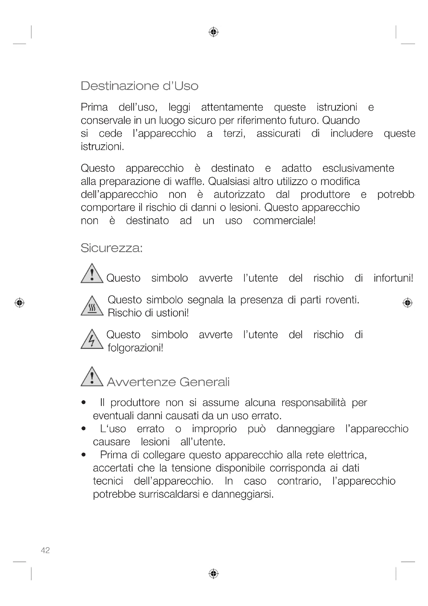 Waffle alla Mela Ingredienti: 150g burro o margarina 200g zucchero 4 uova ½ cucchiaino raso di sale da tavola 250g amido di mais 1 cucchiaino raso di lievito chimico 1 cucchiaino raso di cannella 1 pizzico di chiodi di garofano in polvere 2 mela tritata Zucchero a velo Preparazione: Mescola tutti gli ingredienti, tranne le mele, con una frusta a mano per circa due minuti. Quindi aggiungere le mele tritate. Pulizia e Manutenzione Prima di procedere alla pulizia, spegni sempre l’apparecchio e staccane la spina. Lascia raffreddare completamente. Non immergere mai l’apparecchio nell’acqua. Pericolo! Scossa Elettrica! Pulisci l’apparecchio e le piastre (4) con un panno morbido inumidito. Dopo la pulizia, asciuga bene l’intero apparecchio e tutte le sue parti. Non utilizzare detergenti aggressivi e/o altri oggetti duri per pulire l’apparecchio. Non lasciare asciugare le macchie. Per rimuovere i residui di cibo applica un po’ di olio da cucina sulle piastre (4) e lasciale accese per qualche minuto. Successivamente, pulisci le piastre (4) con un panno morbido inumidito. Le operazioni di pulizia e manutenzione assegnate all’utente non devono essere effettuate da bambini non supervisionati. Stoccaggio Stacca la spina dell’apparecchio dopo ogni utilizzo e lascialo raffreddare completamente. Tieni l’apparecchio lontano dalla portata dei bambini e riponilo in un luogo pulito e asciutto. Istruzioni per lo smaltimento I dispositivi elettrici di scarto contrassegnati da questo simbolo non vanno smaltiti insieme ai rifiuti domestici, ma raccolti separatamente. Pertanto, alla fine del suo ciclo di servizio, questo dispositivo va consegnato ad un punto di raccolta differenziata o al tuo rivenditore locale. Il Mini Macchina Per Waffle A Cuore 41006 è confezionato in una scatola per la vendita al dettaglio. Queste scatole sono riciclabili, ovvero possono essere riusate.50 Dati Tecnici Voltaggio: 220 – 240 V 50 – 60 Hz Potenza nominale: 550 W Classe di protezione: I Soggettoamodifichesenzapreavviso!ITALIANO Manuale delle Istruzioni