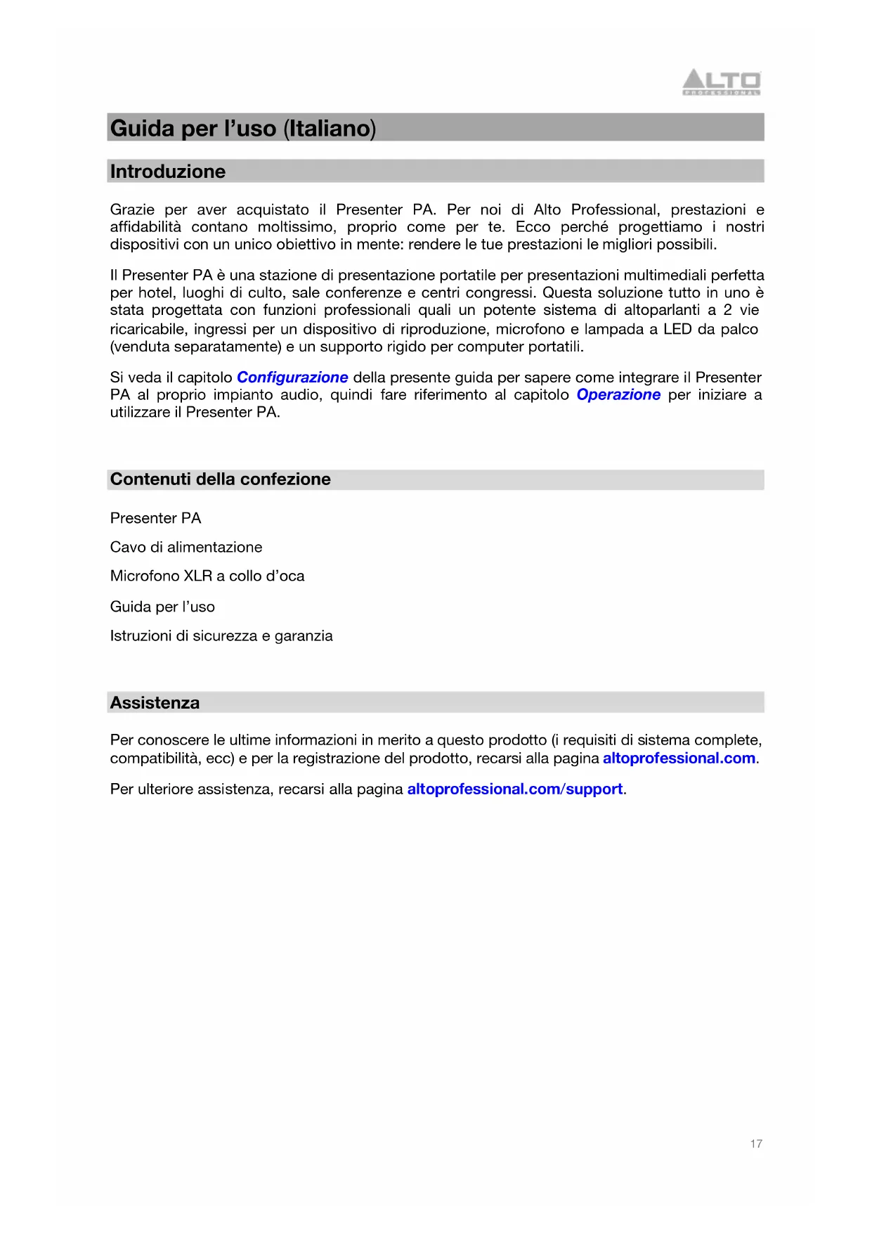Scarica le istruzioni per il tuo Sistema audio in formato PDF gratuitamente! Trova il tuo manuale Presenter PA - ALTO e riprendi in mano il tuo dispositivo elettronico. In questa pagina sono pubblicati tutti i documenti necessari per l'utilizzo del tuo dispositivo. Presenter PA del marchio ALTO.