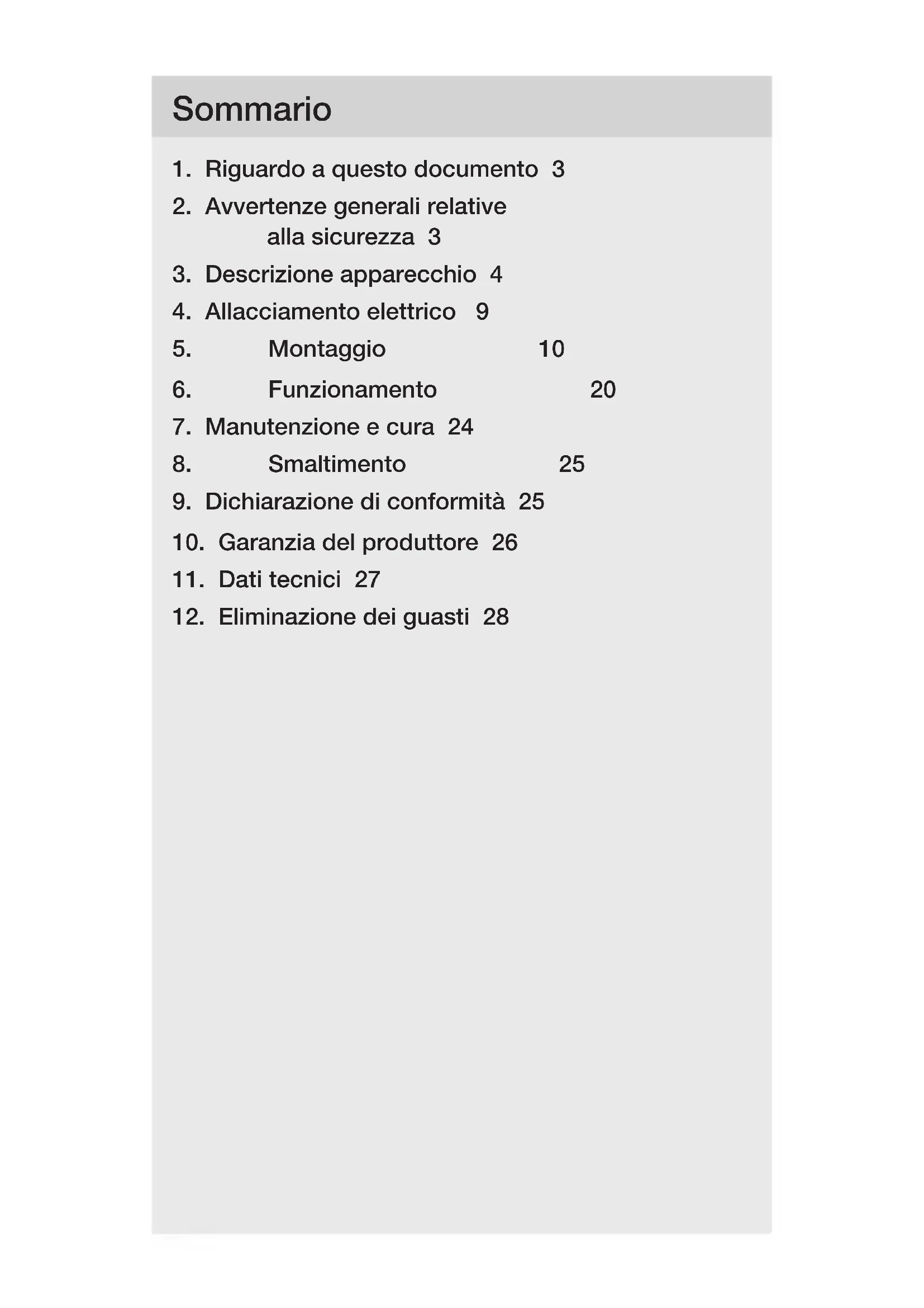- Conservare le istruzioni in un luogo facilmente accessibile. – Nei lavori legati alla corrente elettrica si potrebbero verificare situazioni pericolose. Il contatto con parti con- duttive potrebbe provocare una scossa elettrica, ustioni o addirittura la morte. – I lavori sulla tensione di rete possono essere eseguiti esclusivamente da personale specializzato e qualificato.– 4 – Sommario – Si devono osservare le condizioni di allacciamento e le norme nazionali in materia d’installazione (per es. DE: VDE 0100, AT: ÖVE-ÖNORM E8001-1, CH:SEV 1000). – Utilizzare esclusivamente pezzi di ricambio originali.