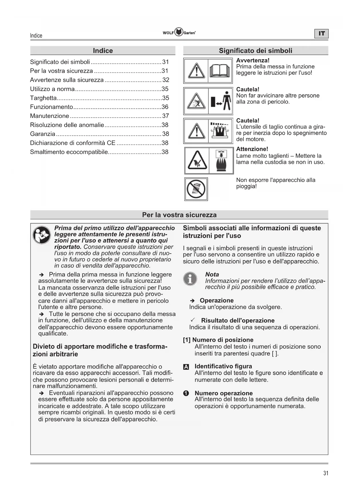 - Smaltimento ecocompatibile Signicato dei simboli Avvertenza! Prima della messa in funzione leggere le istruzioni per l'uso! Cautela! Non far avvicinare altre persone alla zona di pericolo. Cautela! L’utensile di taglio continua a gira- re per inerzia dopo lo spegnimento del motore. Attenzione! Lame molto taglienti – Mettere la lama nella custodia se non in uso. Non esporre l'apparecchio alla pioggia! Per la vostra sicurezzaAvvertenze sulla sicurezza p. 38