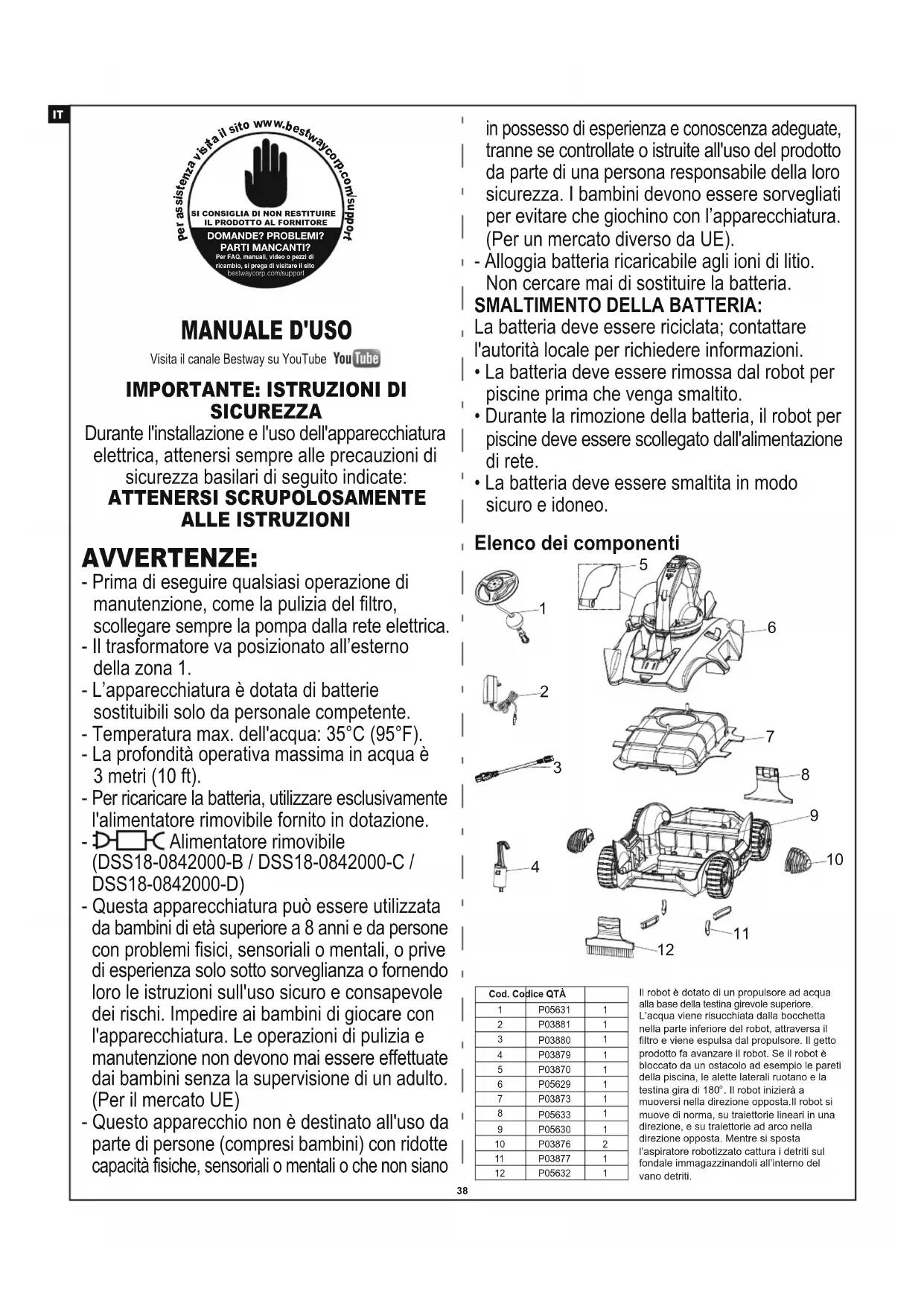 - La batteria deve essere rimossa dal robot per piscine prima che venga smaltito.