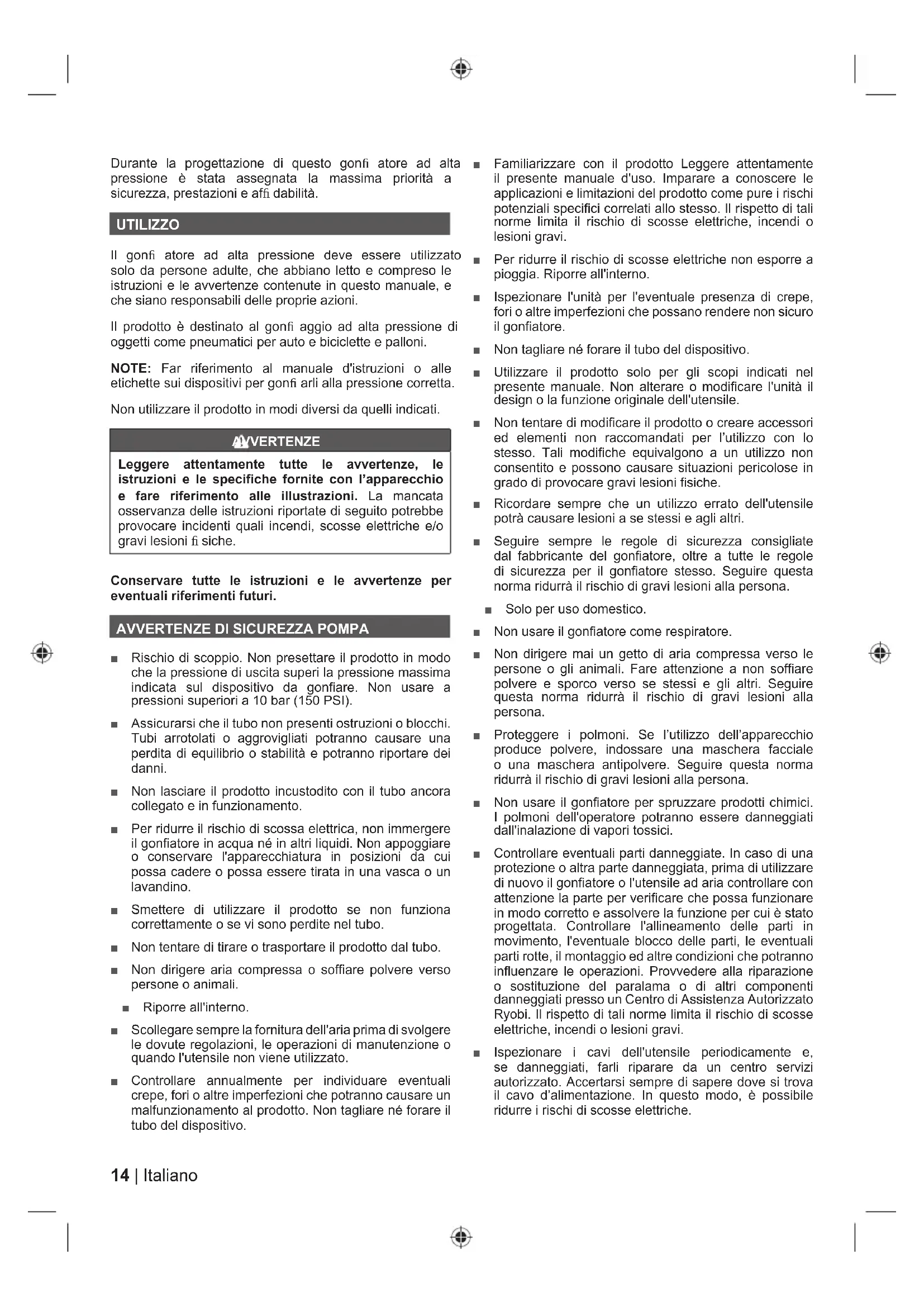 ■ Rischio di scoppio. Non presettare il prodotto in modo che la pressione di uscita superi la pressione massima indicata sul dispositivo da gonfiare. Non usare a pressioni superiori a 10 bar (150 PSI). ■ Assicurarsi che il tubo non presenti ostruzioni o blocchi. Tubi arrotolati o aggrovigliati potranno causare una perdita di equilibrio o stabilità e potranno riportare dei danni. ■ Non lasciare il prodotto incustodito con il tubo ancora collegato e in funzionamento. ■ Per ridurre il rischio di scossa elettrica, non immergere il gonfiatore in acqua né in altri liquidi. Non appoggiare o conservare l'apparecchiatura in posizioni da cui possa cadere o possa essere tirata in una vasca o un lavandino. ■ Smettere di utilizzare il prodotto se non funziona correttamente o se vi sono perdite nel tubo. ■ Non tentare di tirare o trasportare il prodotto dal tubo. ■ Non dirigere aria compressa o soffiare polvere verso persone o animali. ■ Riporre all'interno. ■ Scollegare sempre la fornitura dell'aria prima di svolgere le dovute regolazioni, le operazioni di manutenzione o quando l'utensile non viene utilizzato. ■ Controllare annualmente per individuare eventuali crepe, fori o altre imperfezioni che potranno causare un malfunzionamento al prodotto. Non tagliare né forare il tubo del dispositivo. ■ Familiarizzare con il prodotto Leggere attentamente il presente manuale d'uso. Imparare a conoscere le applicazioni e limitazioni del prodotto come pure i rischi potenziali specifici correlati allo stesso. Il rispetto di tali norme limita il rischio di scosse elettriche, incendi o lesioni gravi. ■ Per ridurre il rischio di scosse elettriche non esporre a pioggia. Riporre all'interno. ■ Ispezionare l'unità per l'eventuale presenza di crepe, fori o altre imperfezioni che possano rendere non sicuro il gonfiatore. ■ Non tagliare né forare il tubo del dispositivo. ■ Utilizzare il prodotto solo per gli scopi indicati nel presente manuale. Non alterare o modificare l'unità il design o la funzione originale dell'utensile. ■ Non tentare di modificare il prodotto o creare accessori ed elementi non raccomandati per l’utilizzo con lo stesso. Tali modifiche equivalgono a un utilizzo non consentito e possono causare situazioni pericolose in grado di provocare gravi lesioni fisiche. ■ Ricordare sempre che un utilizzo errato dell'utensile potrà causare lesioni a se stessi e agli altri. ■ Seguire sempre le regole di sicurezza consigliate dal fabbricante del gonfiatore, oltre a tutte le regole di sicurezza per il gonfiatore stesso. Seguire questa norma ridurrà il rischio di gravi lesioni alla persona. ■ Solo per uso domestico. ■ Non usare il gonfiatore come respiratore. ■ Non dirigere mai un getto di aria compressa verso le persone o gli animali. Fare attenzione a non soffiare polvere e sporco verso se stessi e gli altri. Seguire questa norma ridurrà il rischio di gravi lesioni alla persona. ■ Proteggere i polmoni. Se l’utilizzo dell’apparecchio produce polvere, indossare una maschera facciale o una maschera antipolvere. Seguire questa norma ridurrà il rischio di gravi lesioni alla persona. ■ Non usare il gonfiatore per spruzzare prodotti chimici. I polmoni dell'operatore potranno essere danneggiati dall'inalazione di vapori tossici. ■ Controllare eventuali parti danneggiate. In caso di una protezione o altra parte danneggiata, prima di utilizzare di nuovo il gonfiatore o l'utensile ad aria controllare con attenzione la parte per verificare che possa funzionare in modo corretto e assolvere la funzione per cui è stato progettata. Controllare l'allineamento delle parti in movimento, l'eventuale blocco delle parti, le eventuali parti rotte, il montaggio ed altre condizioni che potranno influenzare le operazioni. Provvedere alla riparazione o sostituzione del paralama o di altri componenti danneggiati presso un Centro di Assistenza Autorizzato Ryobi. Il rispetto di tali norme limita il rischio di scosse elettriche, incendi o lesioni gravi. ■ Ispezionare i cavi dell'utensile periodicamente e, se danneggiati, farli riparare da un centro servizi autorizzato. Accertarsi sempre di sapere dove si trova il cavo d’alimentazione. In questo modo, è possibile ridurre i rischi di scosse elettriche.15 Italiano |