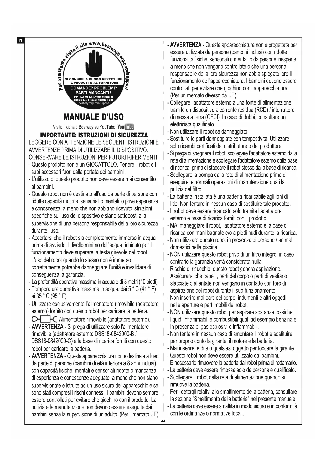 - Questo prodotto non è un GIOCATTOLO. Tenere il robot e i suoi accessori fuori dalla portata dei bambini . - L'utilizzo di questo prodotto non deve essere mai consentito ai bambini. - Questo robot non è destinato all'uso da parte di persone con ridotte capacità motorie, sensoriali o mentali, o prive esperienza e conoscenza, a meno che non abbiano ricevuto istruzioni specifiche sull'uso del dispositivo e siano sottoposti alla supervisione di una persona responsabile della loro sicurezza durante l'uso. - Accertarsi che il robot sia completamente immerso in acqua prima di avviarlo. Il livello minimo dell'acqua richiesto per il funzionamento deve superare la testa girevole del robot. L'uso del robot quando lo stesso non è immerso correttamente potrebbe danneggiare l'unità e invalidare di conseguenza la garanzia. - La profondità operativa massima in acqua è di 3 metri (10 piedi). - Temperatura operativa massima in acqua: dai 5 ° C (41 ° F) ai 35 ° C (95 ° F). - Utilizzare esclusivamente l'alimentatore rimovibile (adattatore esterno) fornito con questo robot per caricare la batteria. - Alimentatore rimovibile (adattatore esterno). - AVVERTENZA - Si prega di utilizzare solo l'alimentatore rimovibile (adattatore esterno: DSS18-0842000-B / DSS18-0842000-C) e la base di ricarica forniti con questo robot per caricare la batteria. - AVVERTENZA - Questa apparecchiatura non è destinata all'uso da parte di persone (bambini di età inferiore a 8 anni inclusi) con capacità fisiche, mentali e sensoriali ridotte o mancanza di esperienza e conoscenze adeguate, a meno che non siano supervisionate e istruite ad un uso sicuro dell'apparecchio e se sono stati compresi i rischi connessi. I bambini devono sempre essere controllati per evitare che giochino con il prodotto. La pulizia e la manutenzione non devono essere eseguite dai bambini senza la supervisione di un adulto. (Per il mercato UE) - AVVERTENZA - Questa apparecchiatura non è progettata per essere utilizzata da persone (bambini inclusi) con ridotte funzionalità fisiche, sensoriali o mentali o da persone inesperte, a meno che non vengano controllate o che una persona responsabile della loro sicurezza non abbia spiegato loro il funzionamento dell’apparecchiatura. I bambini devono essere controllati per evitare che giochino con l’apparecchiatura. (Per un mercato diverso da UE) - Collegare l'adattatore esterno a una fonte di alimentazione tramite un dispositivo a corrente residua (RCD) / interruttore di messa a terra (GFCI). In caso di dubbi, consultare un elettricista qualificato. - Non utilizzare il robot se danneggiato. - Sostituire le parti danneggiate con tempestività. Utilizzare solo ricambi certificati dal distributore o dal produttore. - Si prega di spegnere il robot, scollegare l'adattatore esterno dalla rete di alimentazione e scollegare l'adattatore esterno dalla base di ricarica, prima di staccare il robot stesso dalla base di ricarica. - Scollegare la pompa dalla rete di alimentazione prima di eseguire le normali operazioni di manutenzione quali la pulizia del filtro. - La batteria installata è una batteria ricaricabile agli ioni di litio. Non tentare in nessun caso di sostituire tale prodotto. - Il robot deve essere ricaricato solo tramite l'adattatore esterno e base di ricarica forniti con il prodotto. - MAI maneggiare il robot, l'adattatore esterno e la base di ricarica con mani bagnate e/o a piedi nudi durante la ricarica. - Non utilizzare questo robot in presenza di persone / animali domestici nella piscina. - NON utilizzare questo robot privo di un filtro integro, in caso contrario la garanzia verrà considerata nulla. - Rischio di risucchio: questo robot genera aspirazione. Assicurarsi che capelli, parti del corpo o parti di vestiario slacciate o allentate non vengano in contatto con foro di aspirazione del robot durante il suo funzionamento. - Non inserire mai parti del corpo, indumenti e altri oggetti nelle aperture e parti mobili del robot. - NON utilizzare questo robot per aspirare sostanze tossiche, liquidi infiammabili e combustibili quali ad esempio benzina e in presenza di gas esplosivi o infiammabili. - Non tentare in nessun caso di smontare il robot e sostituire per proprio conto la girante, il motore e la batteria. - Mai inserire le dita o qualsiasi oggetto per toccare la girante. - Questo robot non deve essere utilizzato dai bambini. - È necessario rimuovere la batteria dal robot prima di rottamarlo. - La batteria deve essere rimossa solo da personale qualificato. - Scollegare il robot dalla rete di alimentazione quando si rimuove la batteria. - Per i dettagli relativi allo smaltimento della batteria, consultare la sezione "Smaltimento della batteria" nel presente manuale. - La batteria deve essere smaltita in modo sicuro e in conformità con le ordinanze o normative locali. - Il robot è dotato di una batteria ricaricabile agli ioni di litio che non richiede manutenzione e deve essere smaltita correttamente. Riciclaggio obbligatorio; si prega di contattare le autorità locali per ulteriori informazioni. - Adattatore esterno e base di ricarica: