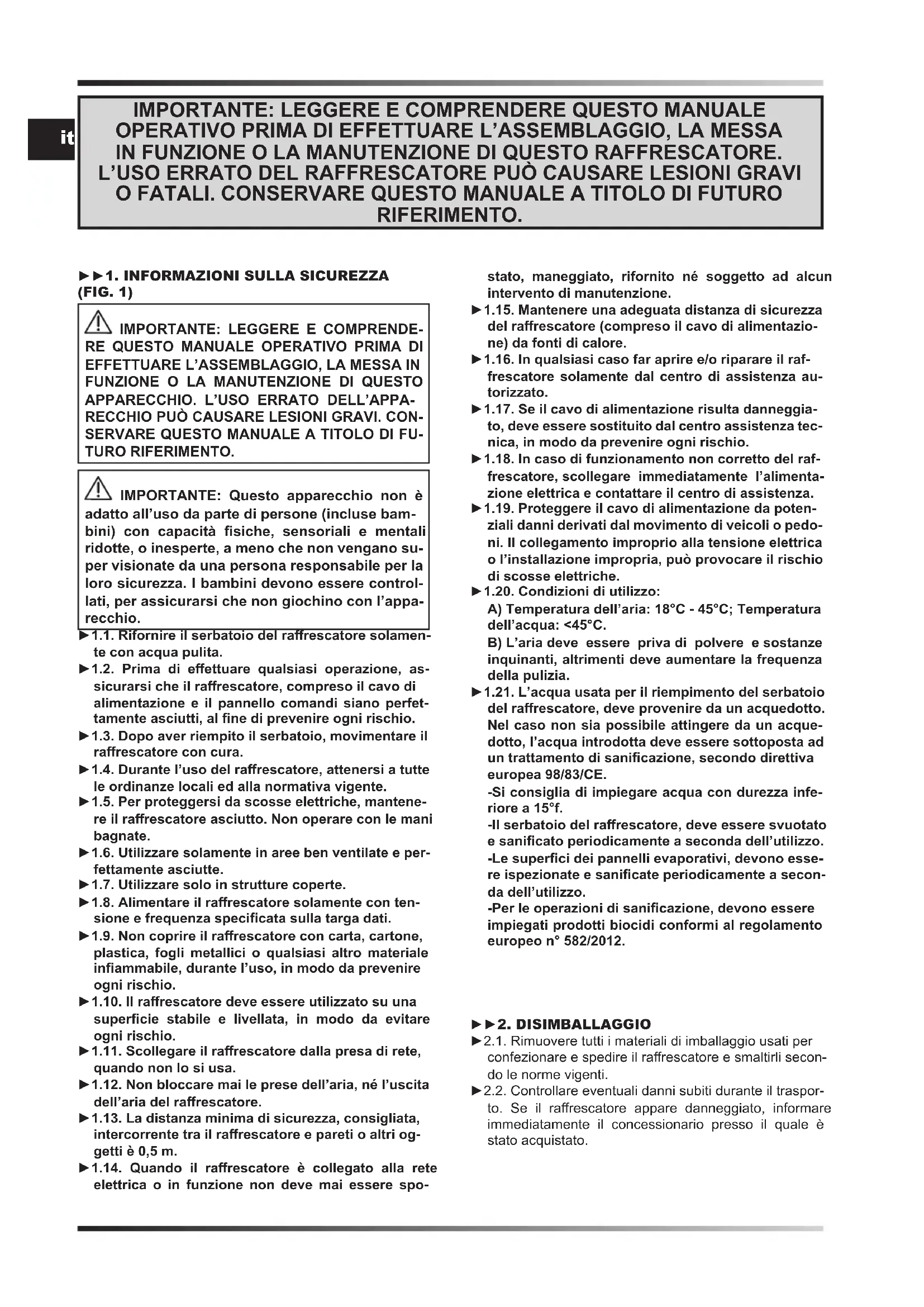 SERVARE QUESTO MANUALE A TITOLO DI FU- TURO RIFERIMENTO. IMPORTANTE: Questo apparecchio non è adatto all’uso da parte di persone (incluse bam- bini) con capacità siche, sensoriali e mentali ridotte, o inesperte, a meno che non vengano su- per visionate da una persona responsabile per la loro sicurezza. I bambini devono essere control- lati, per assicurarsi che non giochino con l’appa- recchio. ►1.1. Rifornire il serbatoio del rarescatore solamen- te con acqua pulita. ►1.2. Prima di eettuare qualsiasi operazione, as- sicurarsi che il rarescatore, compreso il cavo di alimentazione e il pannello comandi siano perfet- tamente asciutti, al ne di prevenire ogni rischio. ►1.3. Dopo aver riempito il serbatoio, movimentare il rarescatore con cura. ►1.4. Durante l’uso del rarescatore, attenersi a tutte le ordinanze locali ed alla normativa vigente. ►1.5. Per proteggersi da scosse elettriche, mantene- re il rarescatore asciutto. Non operare con le mani bagnate. ►1.6. Utilizzare solamente in aree ben ventilate e per- fettamente asciutte. ►1.7. Utilizzare solo in strutture coperte. ►1.8. Alimentare il rarescatore solamente con ten- sione e frequenza specicata sulla targa dati. ►1.9. Non coprire il rarescatore con carta, cartone, plastica, fogli metallici o qualsiasi altro materiale inammabile, durante l’uso, in modo da prevenire ogni rischio. ►1.10. Il rarescatore deve essere utilizzato su una supercie stabile e livellata, in modo da evitare ogni rischio. ►1.11. Scollegare il rarescatore dalla presa di rete, quando non lo si usa. ►1.12. Non bloccare mai le prese dell’aria, né l’uscita dell’aria del rarescatore. ►1.13. La distanza minima di sicurezza, consigliata, intercorrente tra il rarescatore e pareti o altri og- getti è 0,5 m. ►1.14. Quando il rarescatore è collegato alla rete elettrica o in funzione non deve mai essere spo- stato, maneggiato, rifornito né soggetto ad alcun intervento di manutenzione. ►1.15. Mantenere una adeguata distanza di sicurezza del rarescatore (compreso il cavo di alimentazio- ne) da fonti di calore. ►1.16. In qualsiasi caso far aprire e/o riparare il raf- frescatore solamente dal centro di assistenza au- torizzato. ►1.17. Se il cavo di alimentazione risulta danneggia- to, deve essere sostituito dal centro assistenza tec- nica, in modo da prevenire ogni rischio. ►1.18. In caso di funzionamento non corretto del raf- frescatore, scollegare immediatamente l’alimenta- zione elettrica e contattare il centro di assistenza. ►1.19. Proteggere il cavo di alimentazione da poten- ziali danni derivati dal movimento di veicoli o pedo- ni. Il collegamento improprio alla tensione elettrica o l’installazione impropria, può provocare il rischio di scosse elettriche. ►1.20. Condizioni di utilizzo: A) Temperatura dell’aria: 18°C - 45°C; Temperatura dell’acqua: <45°C. B) L’aria deve essere priva di polvere e sostanze inquinanti, altrimenti deve aumentare la frequenza della pulizia. ►1.21. L’acqua usata per il riempimento del serbatoio del rarescatore, deve provenire da un acquedotto. Nel caso non sia possibile attingere da un acque- dotto, l’acqua introdotta deve essere sottoposta ad un trattamento di sanicazione, secondo direttiva europea 98/83/CE. -Si consiglia di impiegare acqua con durezza infe- riore a 15°f. -Il serbatoio del rarescatore, deve essere svuotato e sanicato periodicamente a seconda dell’utilizzo. -Le superci dei pannelli evaporativi, devono esse- re ispezionate e sanicate periodicamente a secon- da dell’utilizzo. -Per le operazioni di sanicazione, devono essere impiegati prodotti biocidi conformi al regolamento europeo n° 582/2012. ►►2. DISIMBALLAGGIO ►2.1. Rimuovere tutti i materiali di imballaggio usati per confezionare e spedire il rarescatore e smaltirli secon- do le norme vigenti. ►2.2. Controllare eventuali danni subiti durante il traspor- to. Se il rarescatore appare danneggiato, informare immediatamente il concessionario presso il quale è stato acquistato.