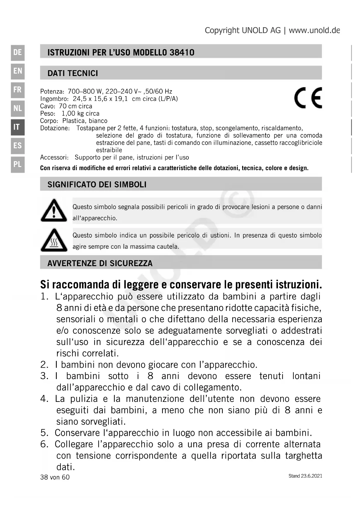 deve essere fornito dal fabbricante o dal suo servizio o di una persona qualificata, in modo simile ad essere sostituito, al fine di evitare rischi. ATTENZIONE: Durante il funzionamento l‘apparecchio diventa molto caldo! Non aprire mai la scocca dell‘apparecchio. Non tenere oggetti, posate o parti del corpo nelle fessure di pane. Pericolo di scossa elettrica. Il produttore non si assume alcuna responsabilità per un montaggio scorretto, un utilizzo inappropriato o errato oppure in seguito a riparazioni effettuate da officine o persone non autorizzate. Copyright UNOLD AG | www.unold.de UNOLD ©Stand 23.6.2021 41 von 60