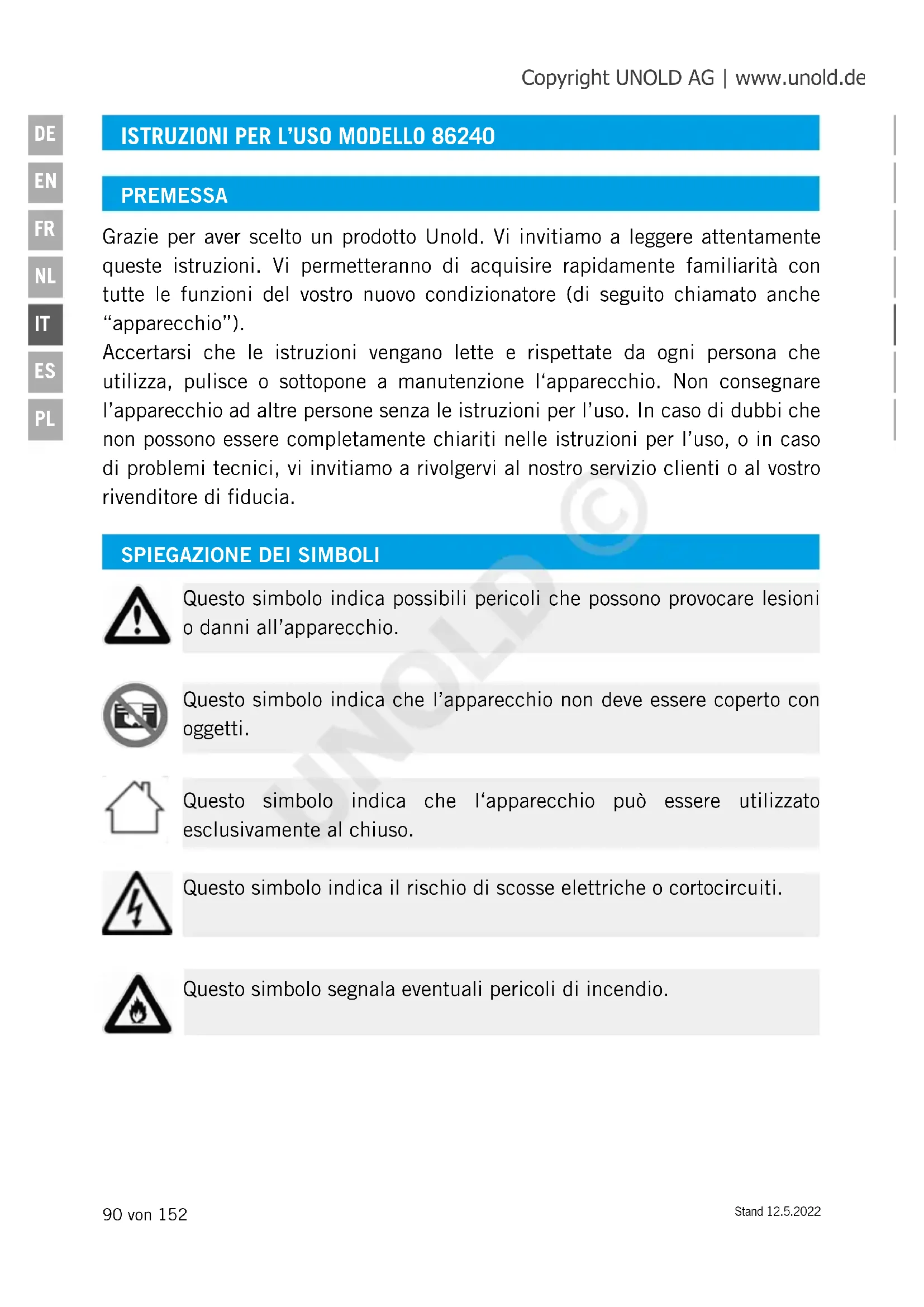 Questo simbolo indica possibili pericoli che possono provocare lesioni o danni all’apparecchio. Questo simbolo indica il rischio di scosse elettriche o cortocircuiti. Questo simbolo indica che l’apparecchio non deve essere coperto con oggetti. Questo simbolo indica che l‘apparecchio può essere utilizzato esclusivamente al chiuso. Questo simbolo segnala eventuali pericoli di incendio. Copyright UNOLD AG | www.unold.de UNOLD ©Stand 12.5.2022 91 von 152