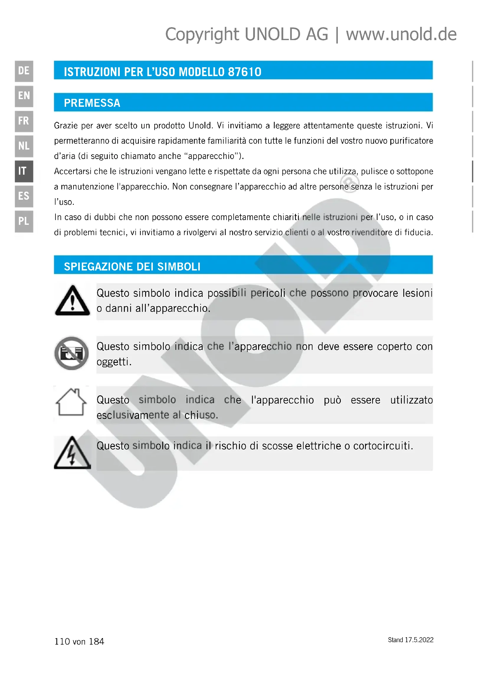 Questo simbolo indica possibili pericoli che possono provocare lesioni o danni all’apparecchio. Questo simbolo indica il rischio di scosse elettriche o cortocircuiti. Questo simbolo indica che l’apparecchio non deve essere coperto con oggetti. Questo simbolo indica che l'apparecchio può essere utilizzato esclusivamente al chiuso. Copyright UNOLD AG | www.unold.deStand 17.5.2022 111 von 184