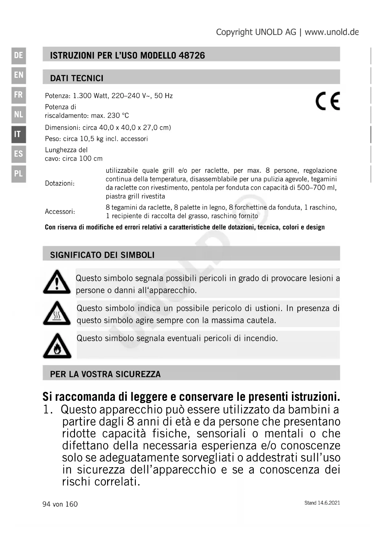partire dagli 8 anni di età e da persone che presentano ridotte capacità fisiche, sensoriali o mentali o che difettano della necessaria esperienza e/o conoscenze solo se adeguatamente sorvegliati o addestrati sull’uso in sicurezza dell’apparecchio e se a conoscenza dei rischi correlati. Questo simbolo segnala eventuali pericoli di incendio. Copyright UNOLD AG | www.unold.de UNOLD ©Stand 14.6.2021 95 von 160