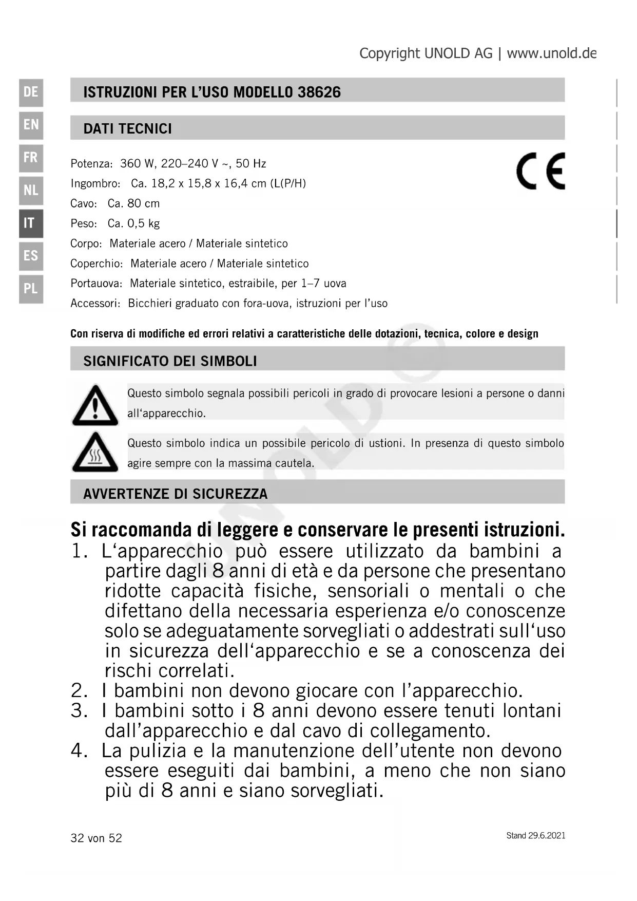 essere eseguiti dai bambini, a meno che non siano più di 8 anni e siano sorvegliati. Copyright UNOLD AG | www.unold.de UNOLD ©Stand 29.6.2021 33 von 52