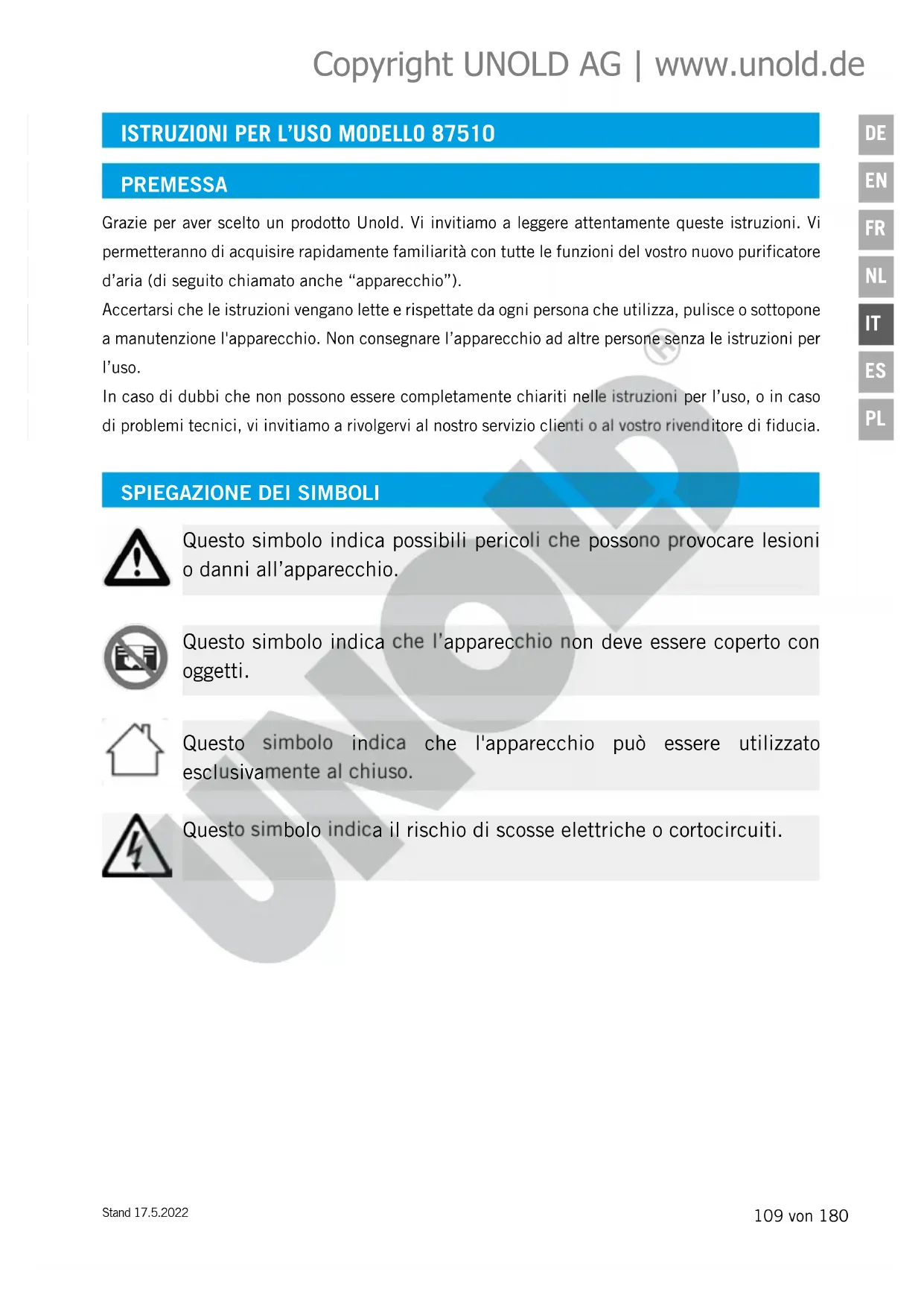 Questo simbolo indica possibili pericoli che possono provocare lesioni o danni all’apparecchio. Questo simbolo indica il rischio di scosse elettriche o cortocircuiti. Questo simbolo indica che l’apparecchio non deve essere coperto con oggetti. Questo simbolo indica che l'apparecchio può essere utilizzato esclusivamente al chiuso. Copyright UNOLD AG | www.unold.de110 von 180 Stand 17.5.2022