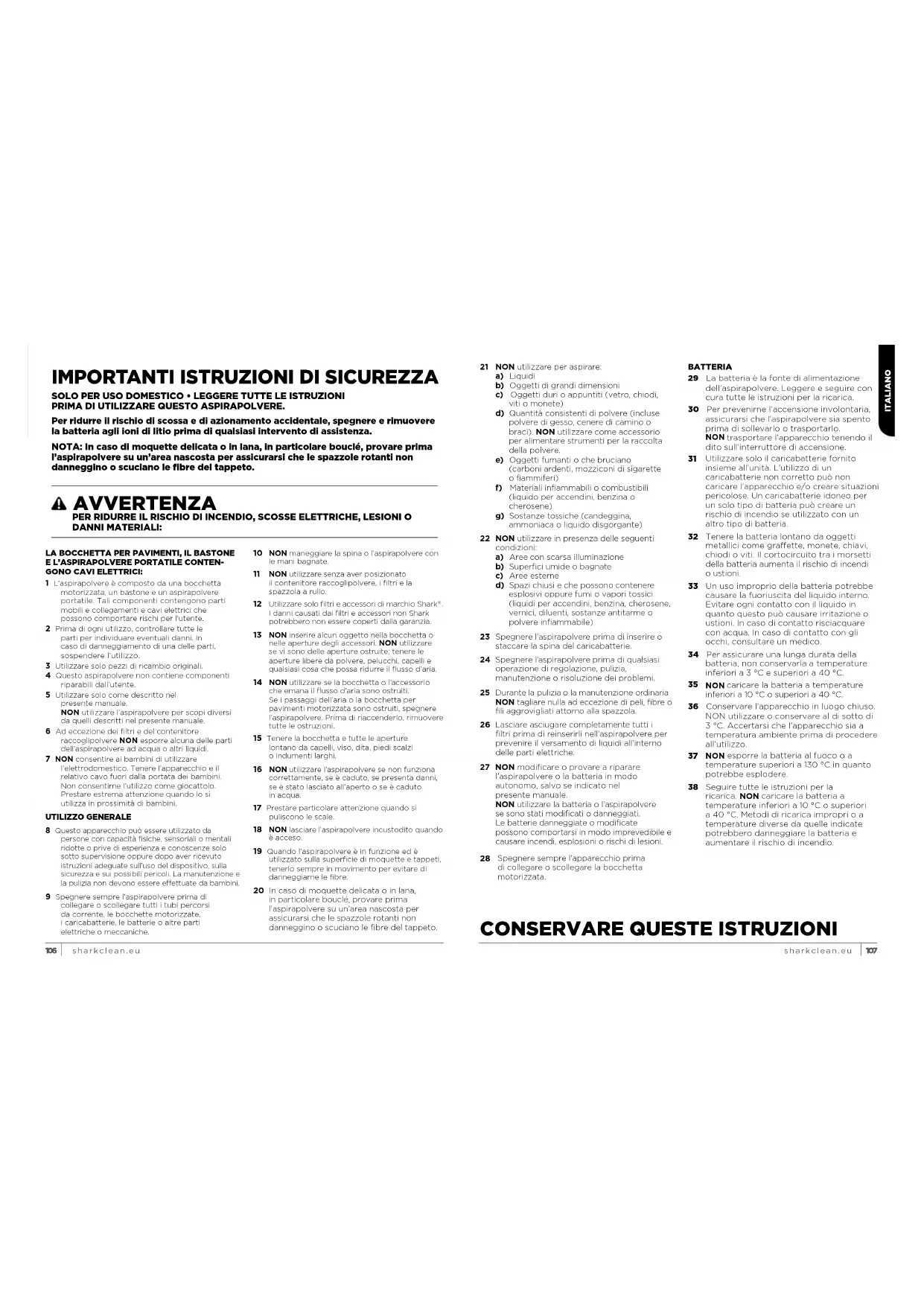 GONO CAVI ELETTRICI: 1 L’aspirapolvere è composto da una bocchetta motorizzata, un bastone e un aspirapolvere portatile. Tali componenti contengono parti mobili e collegamenti e cavi elettrici che possono comportare rischi per l’utente. 2 Prima di ogni utilizzo, controllare tutte le parti per individuare eventuali danni. In caso di danneggiamento di una delle parti, sospenderel’utilizzo. 3 Utilizzare solo pezzi di ricambio originali. 4 Questo aspirapolvere non contiene componenti riparabili dall’utente. 5 Utilizzare solo come descritto nel presentemanuale. NON utilizzare l’aspirapolvere per scopi diversi da quelli descritti nel presente manuale. 6 Ad eccezione dei filtri e del contenitore raccoglipolvere NON esporre alcuna delle parti dell’aspirapolvere ad acqua o altri liquidi. 7 NON consentire ai bambini di utilizzare l’elettrodomestico. Tenere l’apparecchio e il relativo cavo fuori dalla portata dei bambini. Nonconsentirne l’utilizzo come giocattolo. Prestare estrema attenzione quando lo si utilizzain prossimità di bambini. UTILIZZO GENERALE 8 Questo apparecchio può essere utilizzato da persone con capacità fisiche, sensoriali o mentali ridotte o prive di esperienza e conoscenze solo sotto supervisione oppure dopo aver ricevuto istruzioni adeguate sull’uso del dispositivo, sulla sicurezza e sui possibili pericoli. La manutenzione e la pulizia non devono essere eettuate da bambini. 9 Spegnere sempre l’aspirapolvere prima di collegare o scollegare tutti i tubi percorsi da corrente, le bocchette motorizzate, icaricabatterie, le batterie o altre parti elettricheo meccaniche. 10 NON maneggiare la spina o l’aspirapolvere con le mani bagnate. 11 NON utilizzare senza aver posizionato il contenitore raccoglipolvere, i filtri e la spazzolaa rullo. 12 Utilizzare solo filtri e accessori di marchio Shark